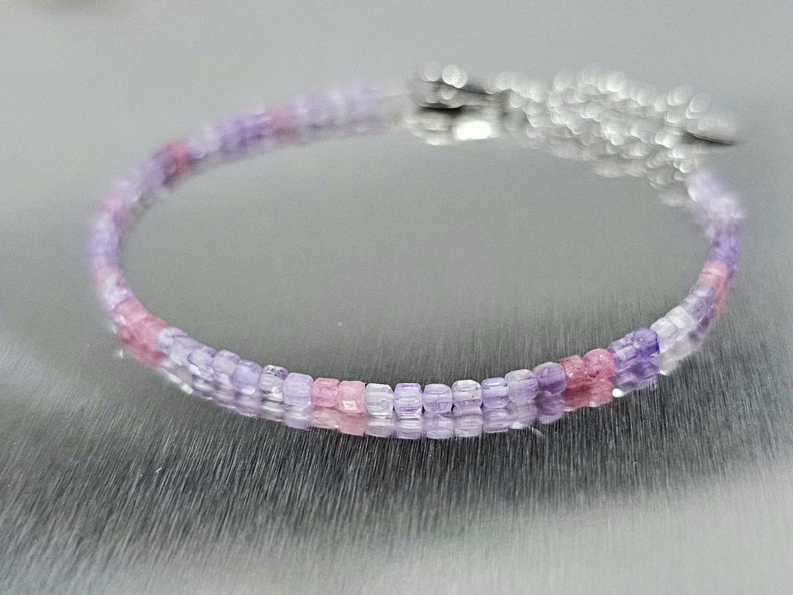 Chiếc vòng này viên đá mài vuông có cạnh chỉ từ 2 đến 2.5mm, lổ xâu cực kỳ nhỏ, nhung chất lượng đá trong, sáng, rất mãn nhãn nhờ phối sắc Omre, chuyển sắc mềm mại: