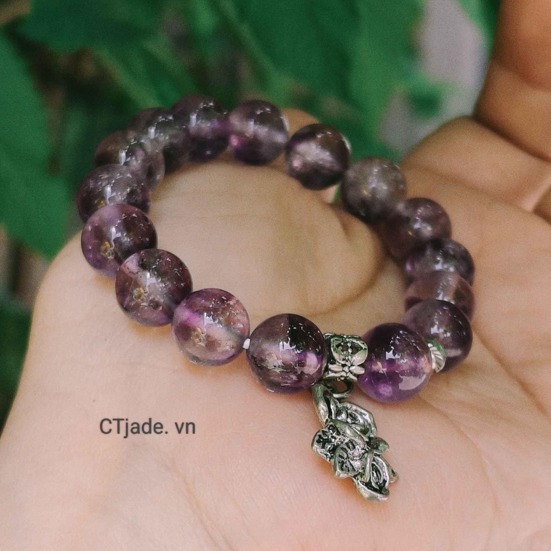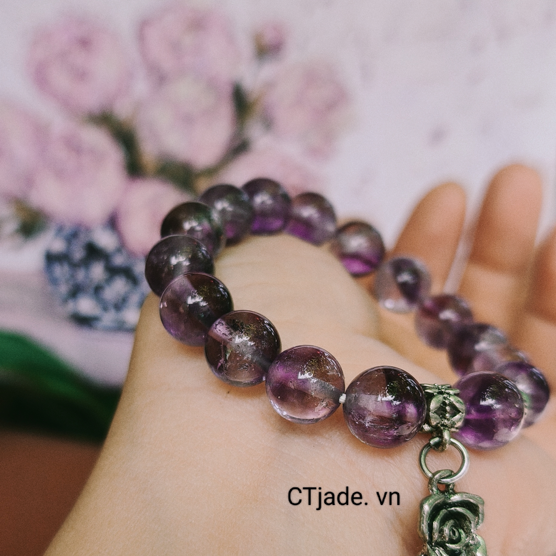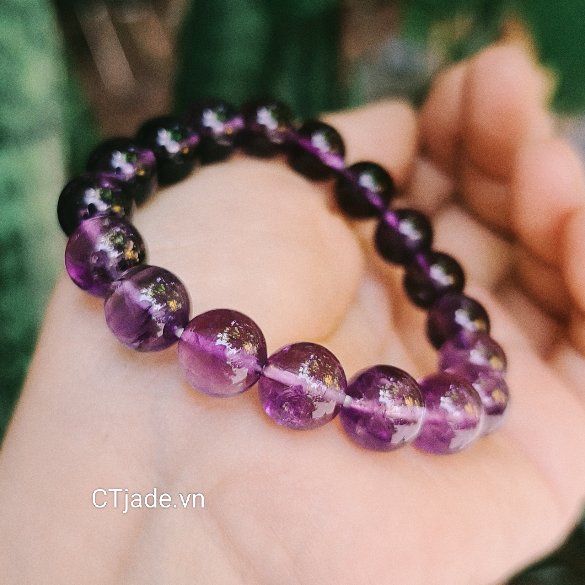 Hãy nhìn những hạt đá – trong suốt và sống động, ánh tím chuyển động như ngọn lửa đang tỏa trong những khối cầu pha lê đẹp tuyệt. Có hạt như khói mờ. Có hạt lại lấp lánh như giọt nước ngân lên sắc tím của hoàng hôn. Một vài vết vân mây tự nhiên khiến chiếc vòng không hề đồng sắc, và đây chính là nét riêng tạo nên phiên bản cá tính.