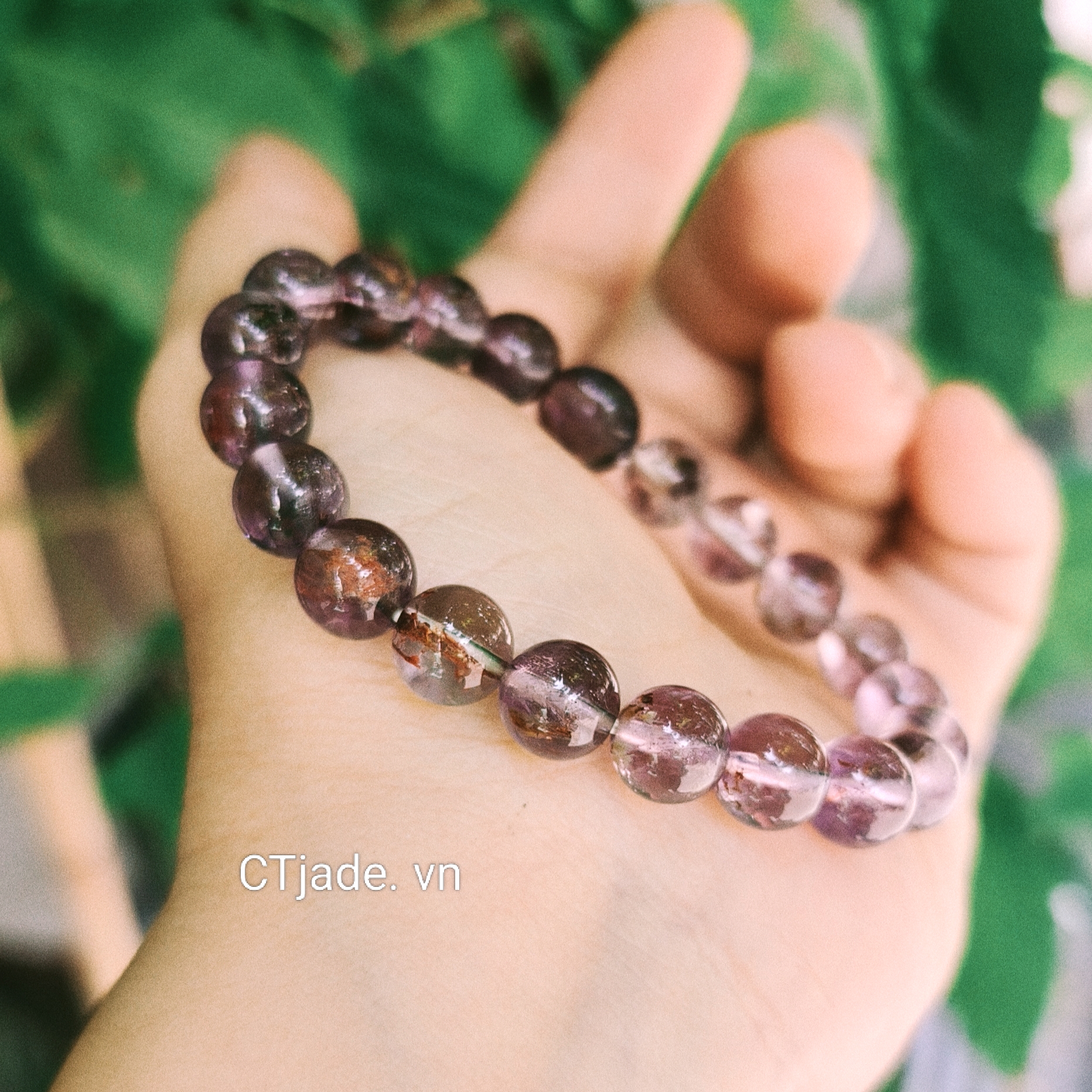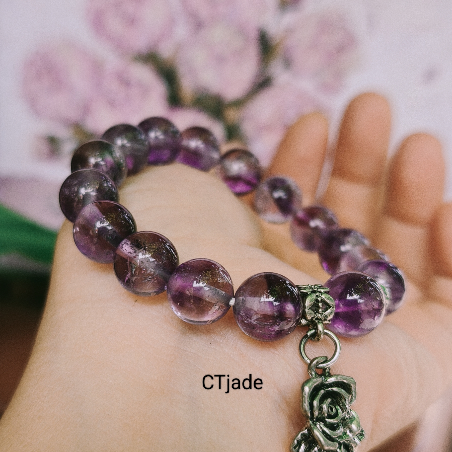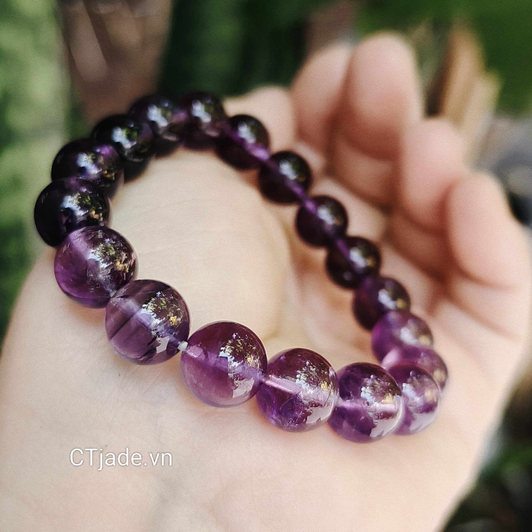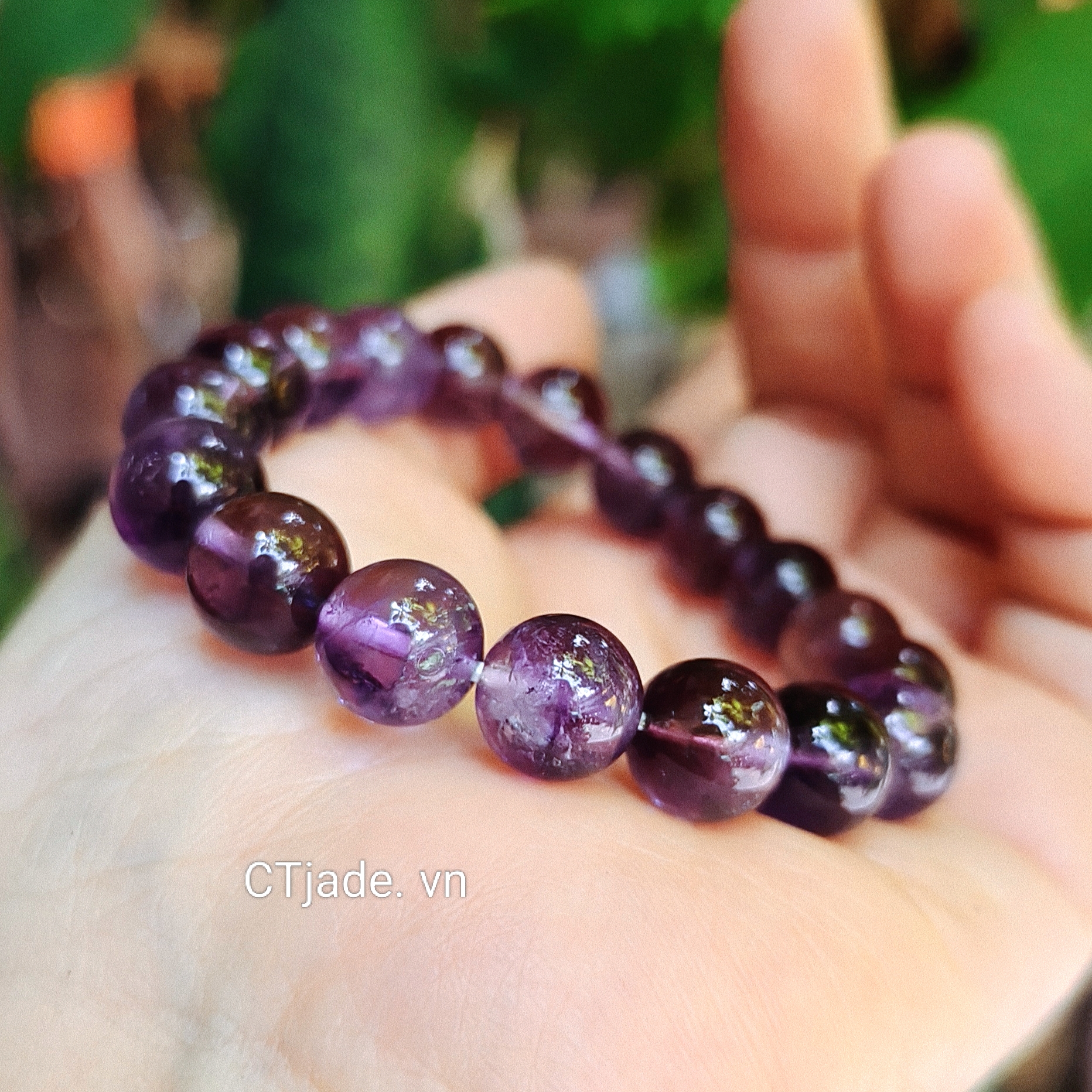 Hãy nhìn những hạt đá – trong suốt và sống động, ánh tím chuyển động như ngọn lửa đang tỏa trong những khối cầu pha lê đẹp tuyệt. Có hạt như khói mờ. Có hạt lại lấp lánh như giọt nước ngân lên sắc tím của hoàng hôn. Một vài vết vân mây tự nhiên khiến chiếc vòng không hề đồng sắc, và đây chính là nét riêng tạo nên phiên bản cá tính.
