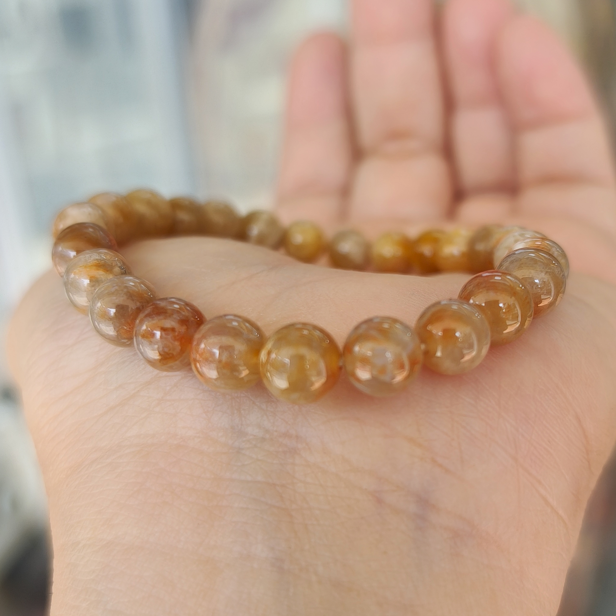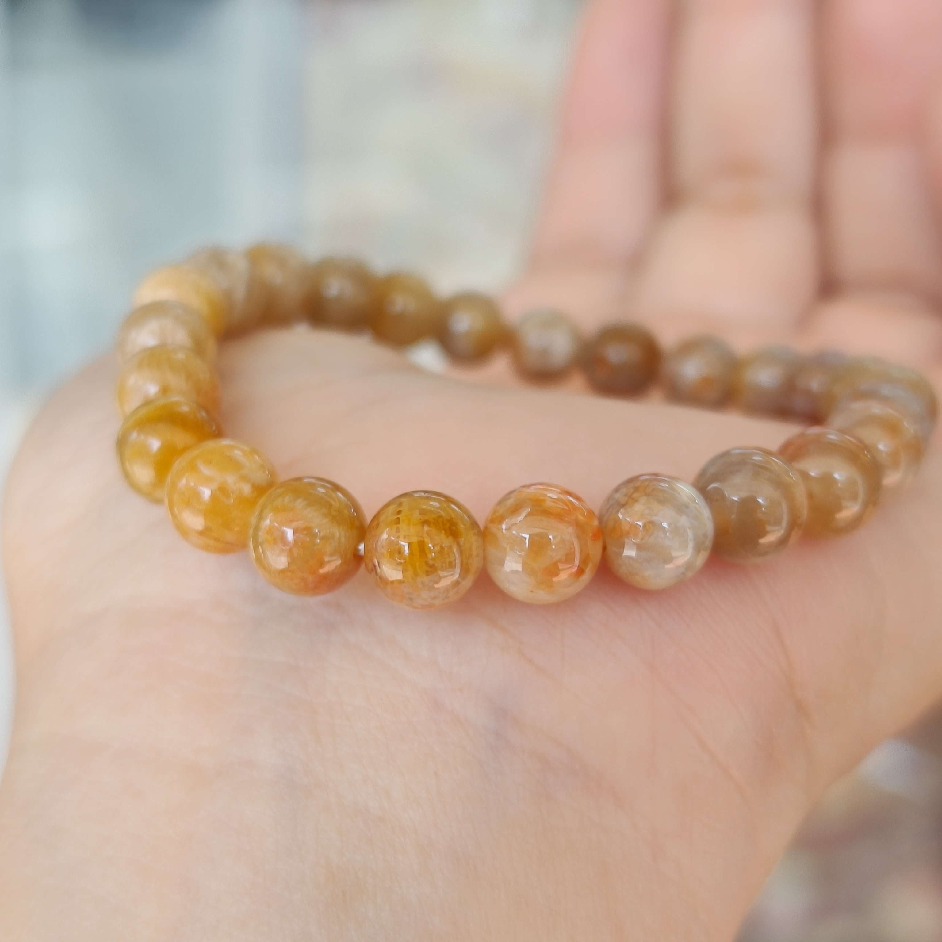 Vòng tay hóa thạch san hô vàng hiếm hơn sắc đỏ cam, hường hường nếu chúng đạt độ trong trẻo hay hoa văn độc đáo.