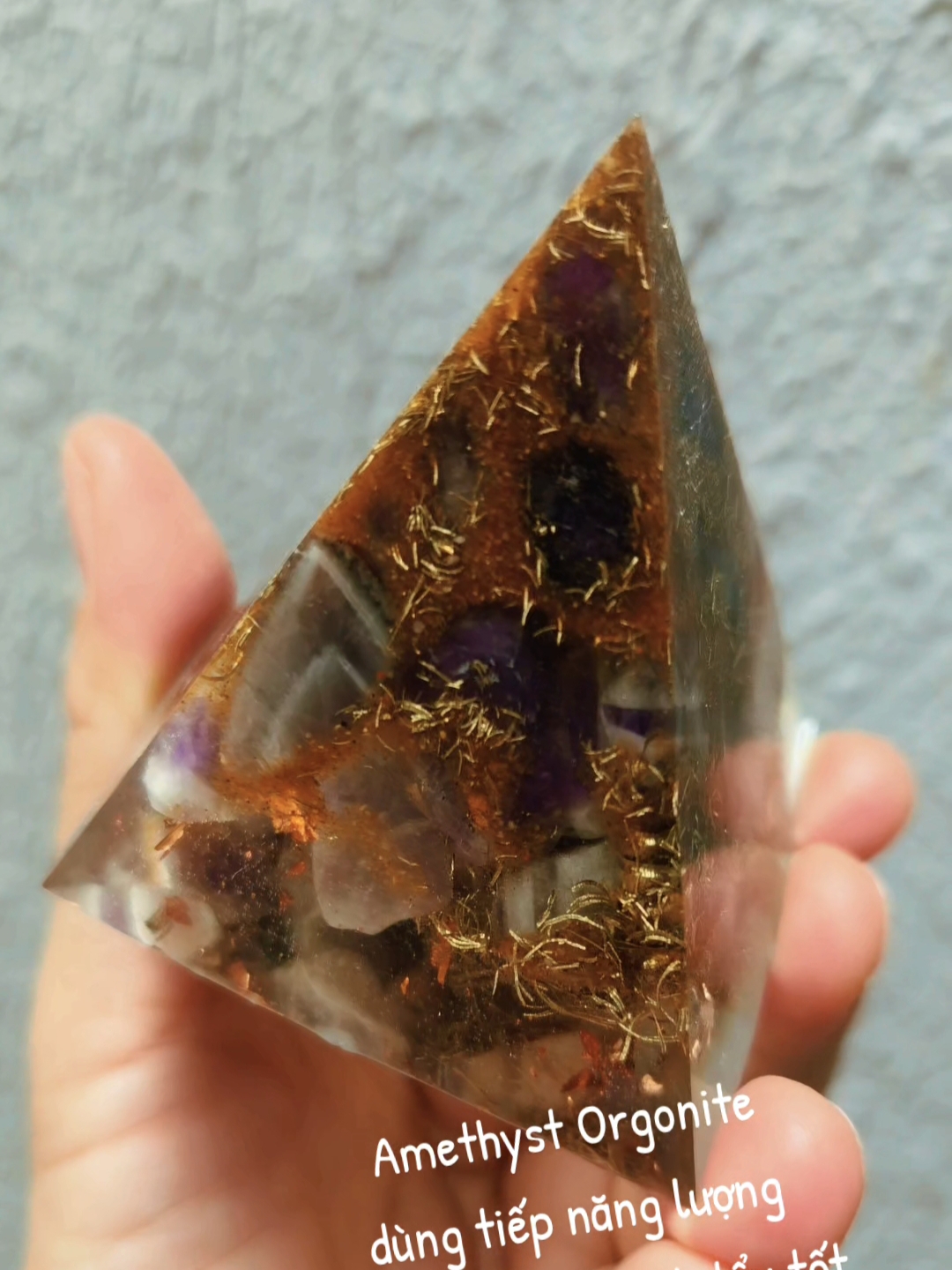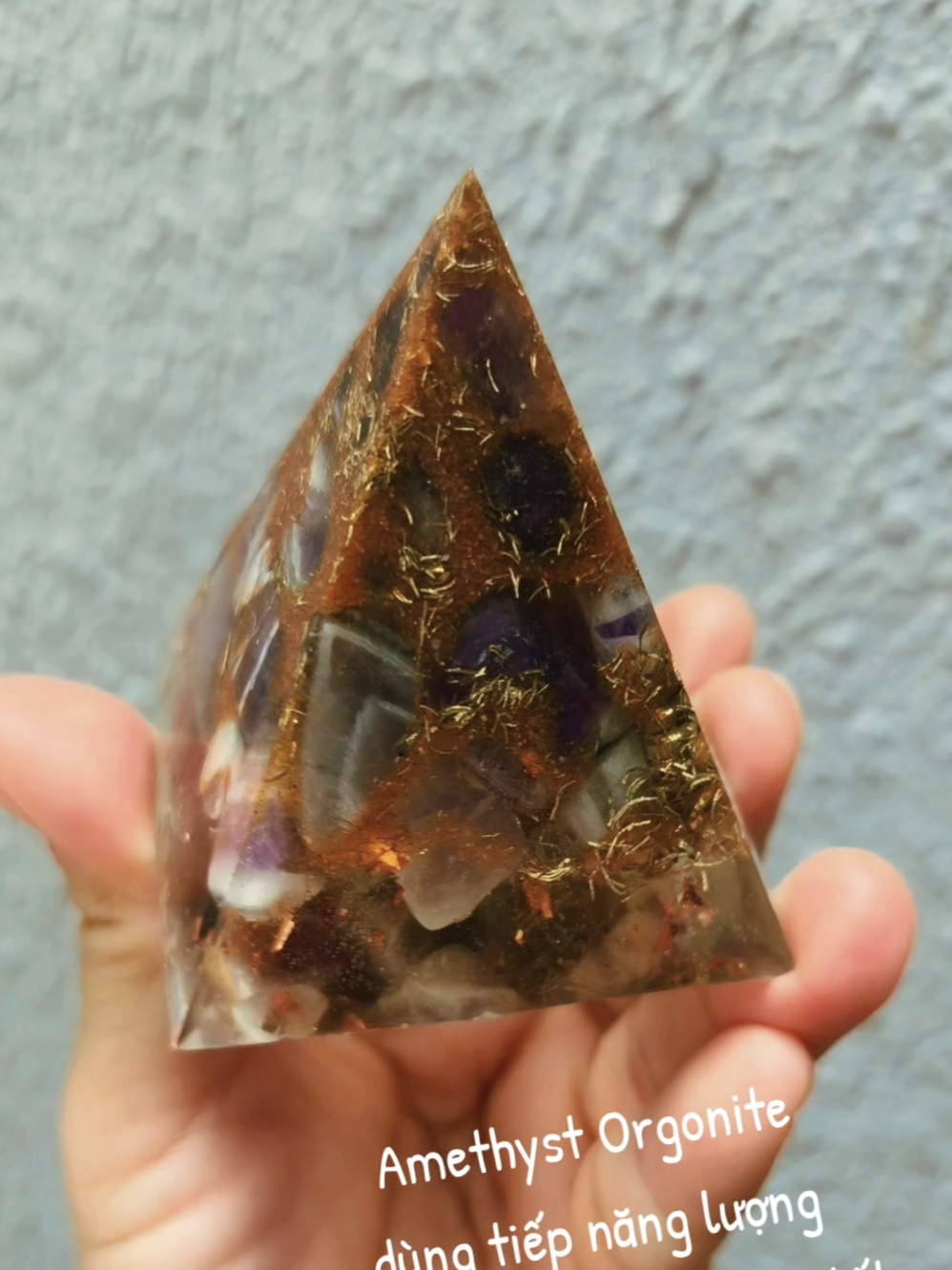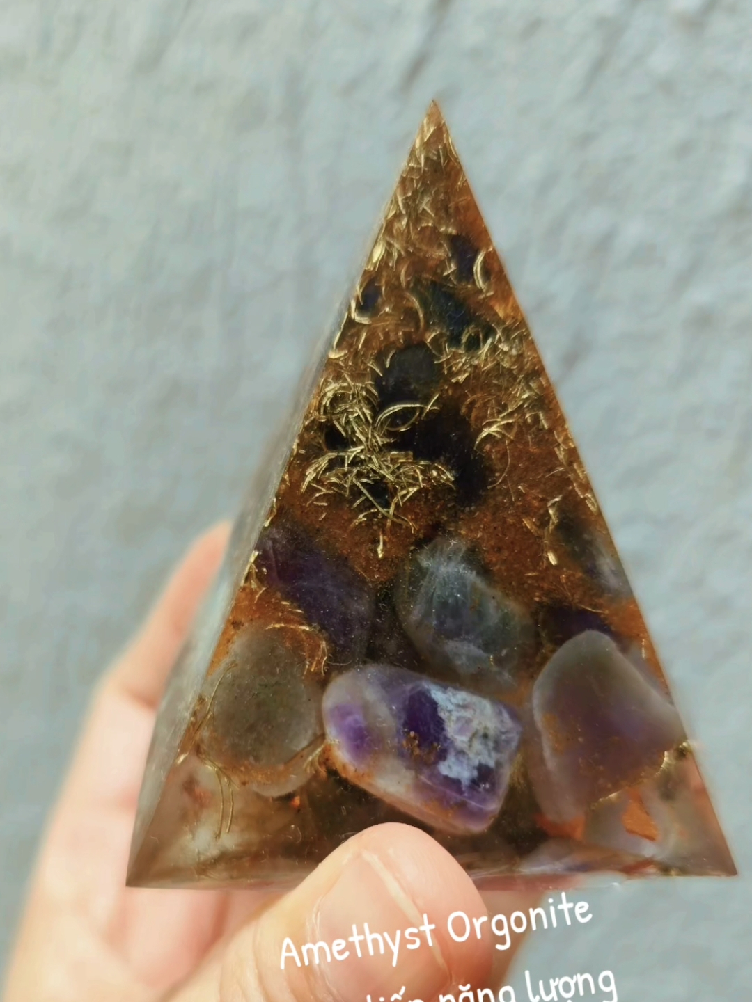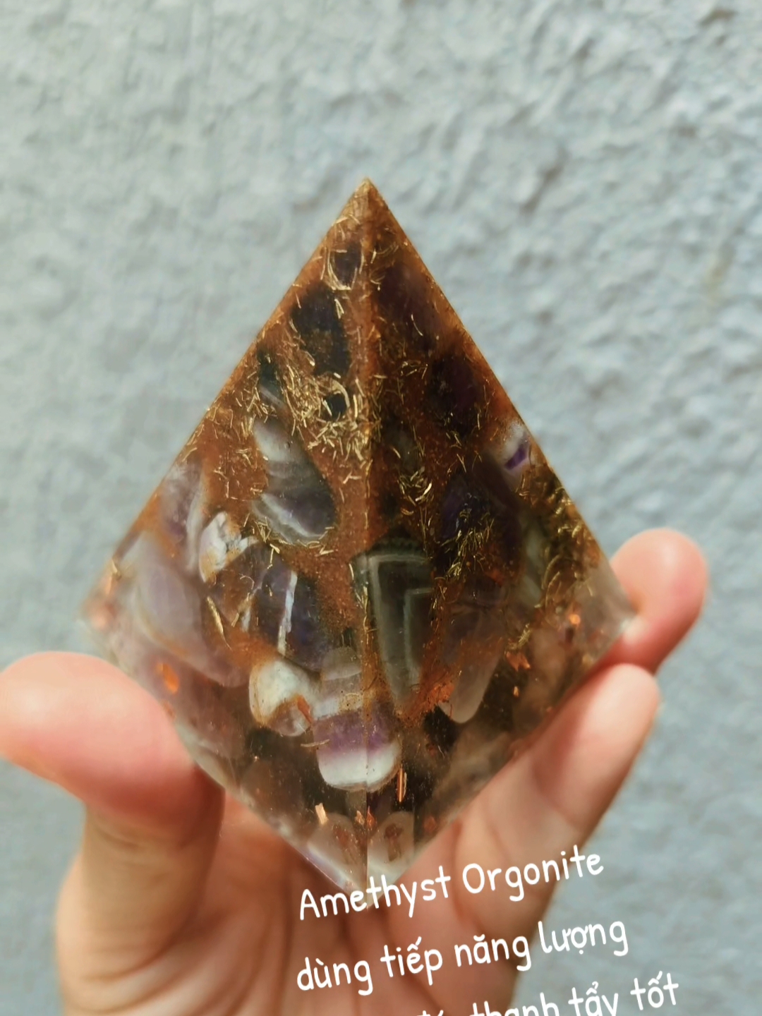 Thành phần: Đá vụn Thạch anh tím, mạc đồng, keo nhựa Resin cao cấp không màu không mùi dùng tạo khối hình học thiêng kim tự tháp.