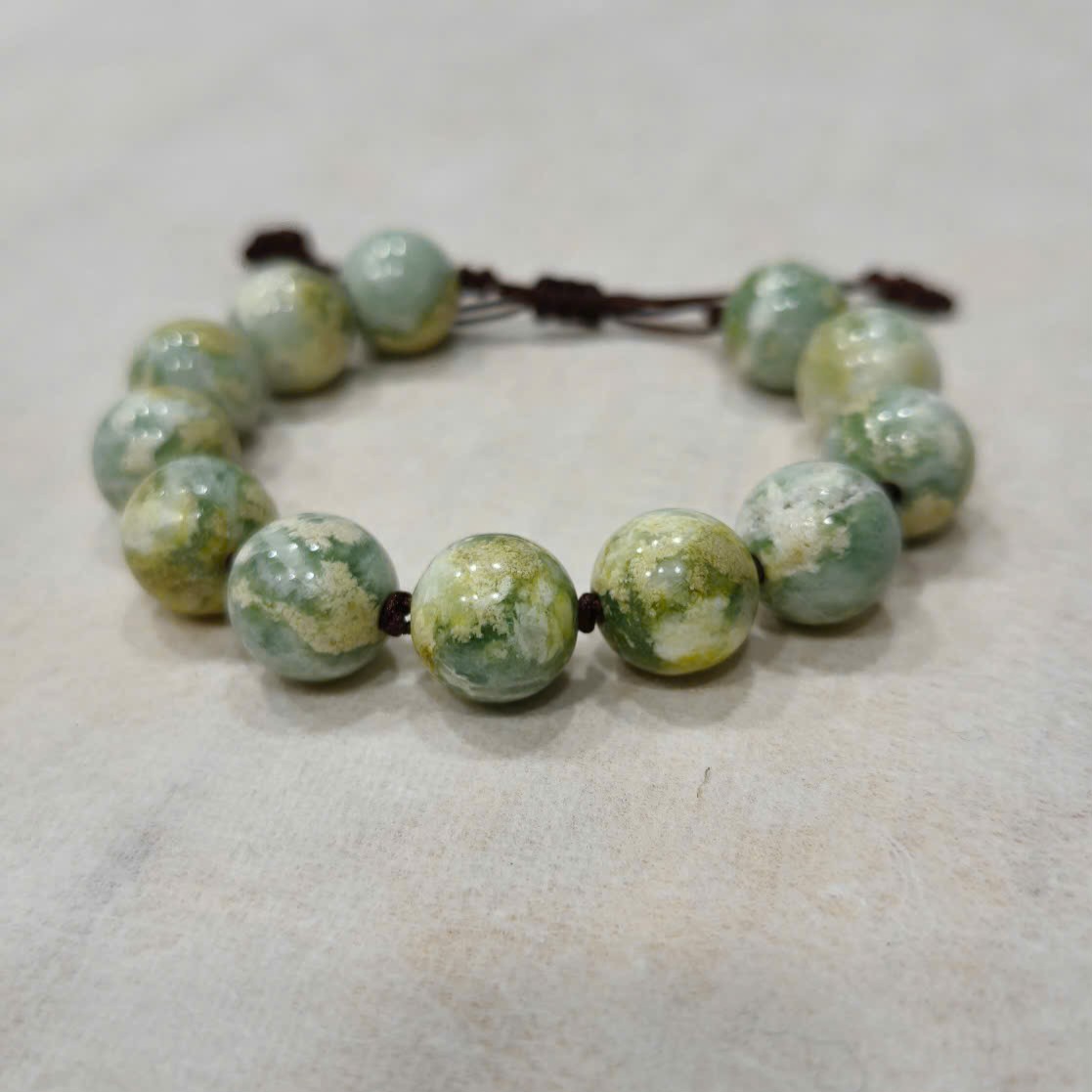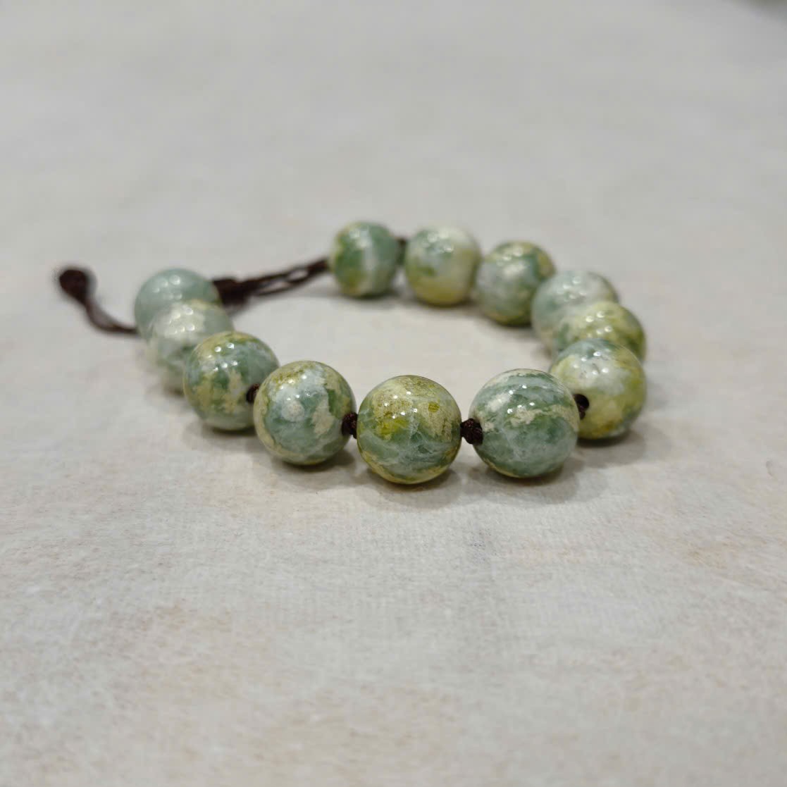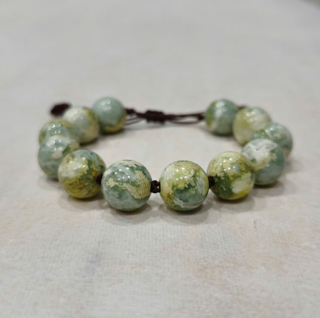 Chiếc vòng này được phối bởi nhưng. Viên đá rất chất, vẻ đẹp đặc trưng của Serpentine, có nắng vàng và có thảo nguyên xanh mát trên từng viên đá. Màu chúng ngọt mát như màu của vỏ ổi. Một màu sắc của sự trù phú thịnh vượng về sự sống.