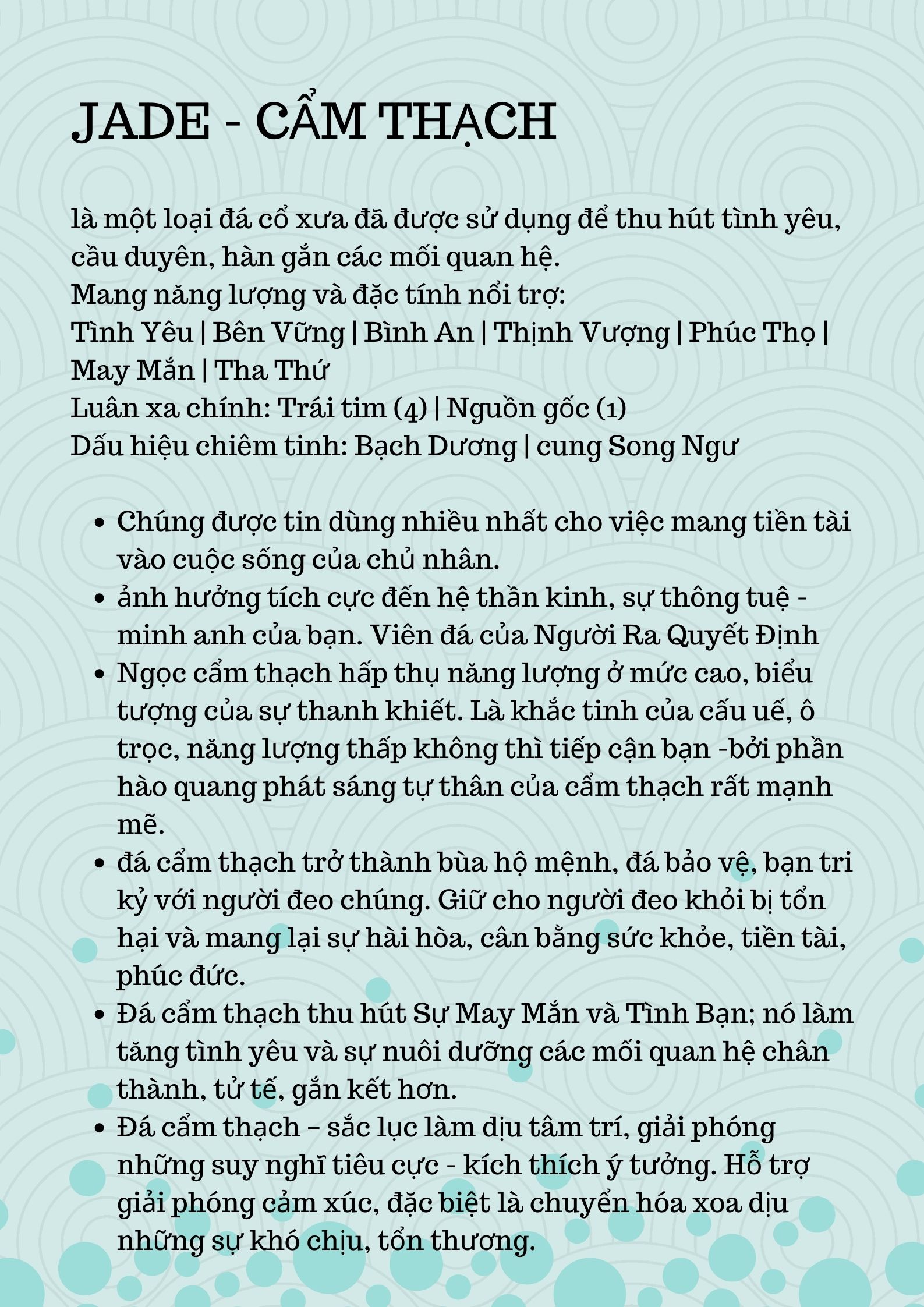 Ngọc cẩm thạch, viên đá được yêu quý từ hàng ngàn hàng vạn năm qua. mang năng lượng Luân xa tim, sức mạnh của tình yêu thương vô hạn. Viên đá của cung Bạch dương, Kim ngưu, Song tử, Thiên Bình. Nguyên tố trái đất. Con số rung động là con số 11.
