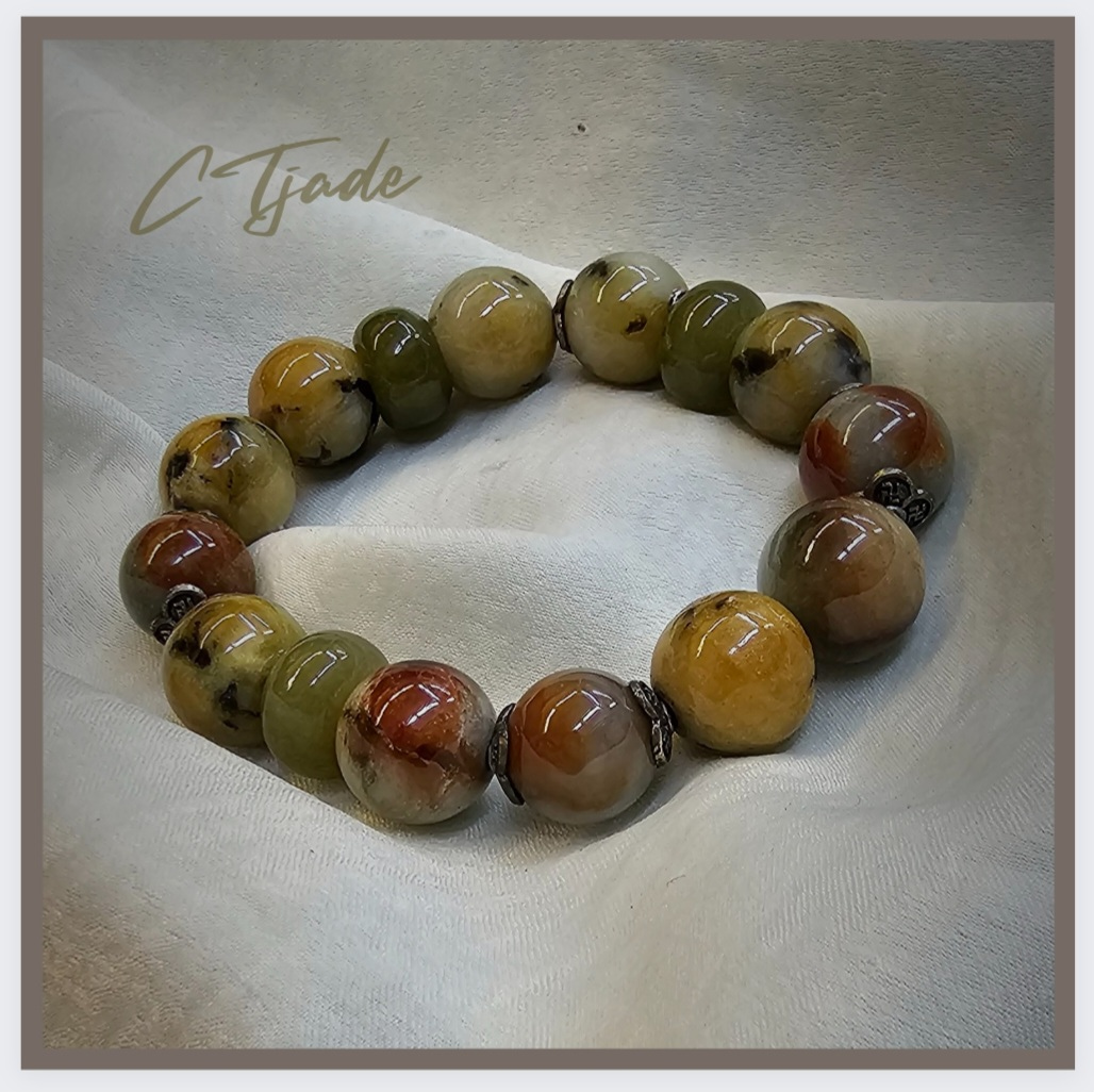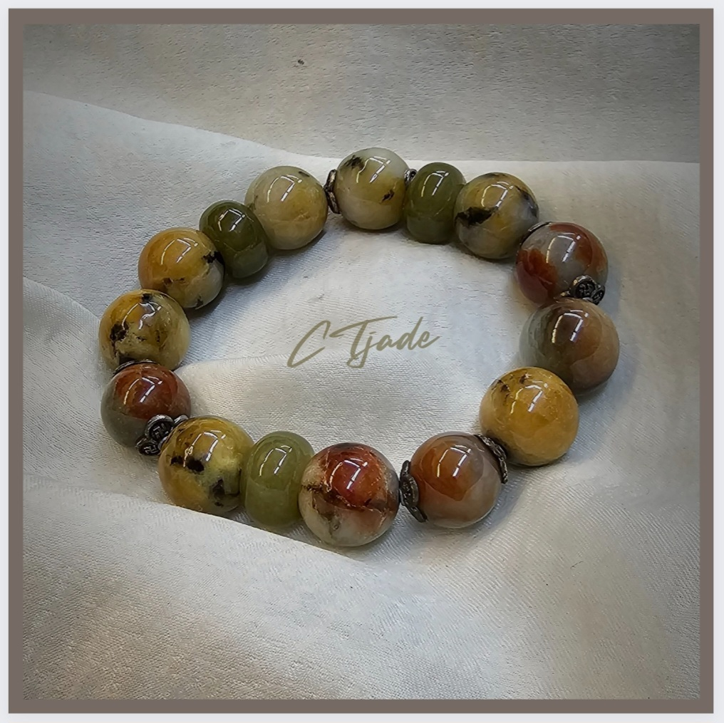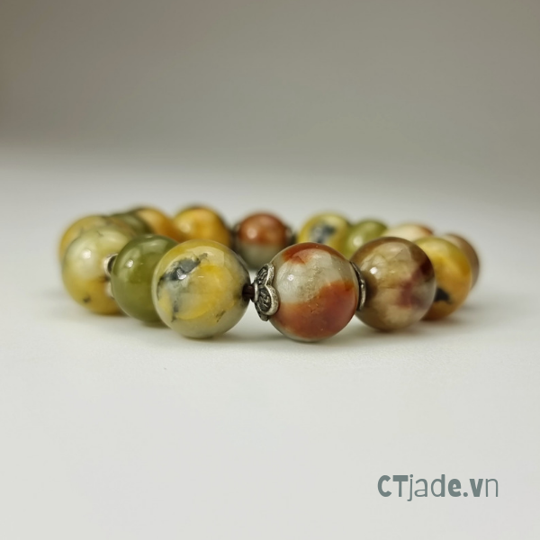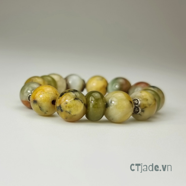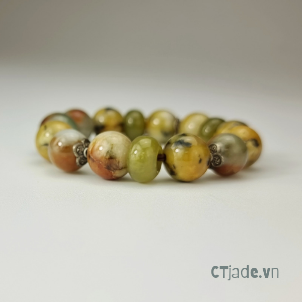 Vòng tay đá cẩm thạch sắc hoàng kim là một tác phẩm nghệ thuật tuyệt vời từ thiên nhiên, được chế tác từ những viên đá có màu sắc vân đá quý hiếm vô cùng. Với vân đá màu sắc như da hổ da báo đốm đen, chiếc vòng tay này trở thành biểu tượng của sức mạnh chúa tể rừng sâu. Nhìn vào chúng, ta có thể cảm nhận được nguồn năng lượng của sự dũng cảm và uy nghi, như một lời khẳng định cho sự bất khả xâm phạm mảnh liệt.