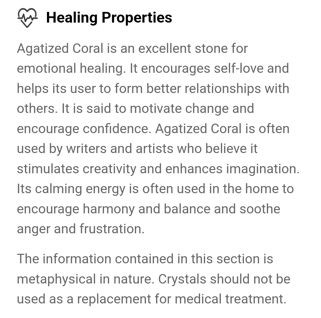 San hô hóa đá là một viên đá tuyệt vời để chữa lành cảm xúc. Nó khuyến khích yêu bản thân và giúp người dùng hình thành mối quan hệ tốt hơn với người khác. Nó được cho là thúc đẩy sự thay đổi và khuyến khích sự tự tin. San hô hóa đá thường được sử dụng bởi các nhà văn và nghệ sĩ tin rằng nó kích thích sự sáng tạo và tăng cường trí tưởng tượng. Năng lượng làm dịu của nó thường được sử dụng trong nhà để khuyến khích sự hòa hợp và cân bằng và làm dịu sự tức giận và thất vọng.