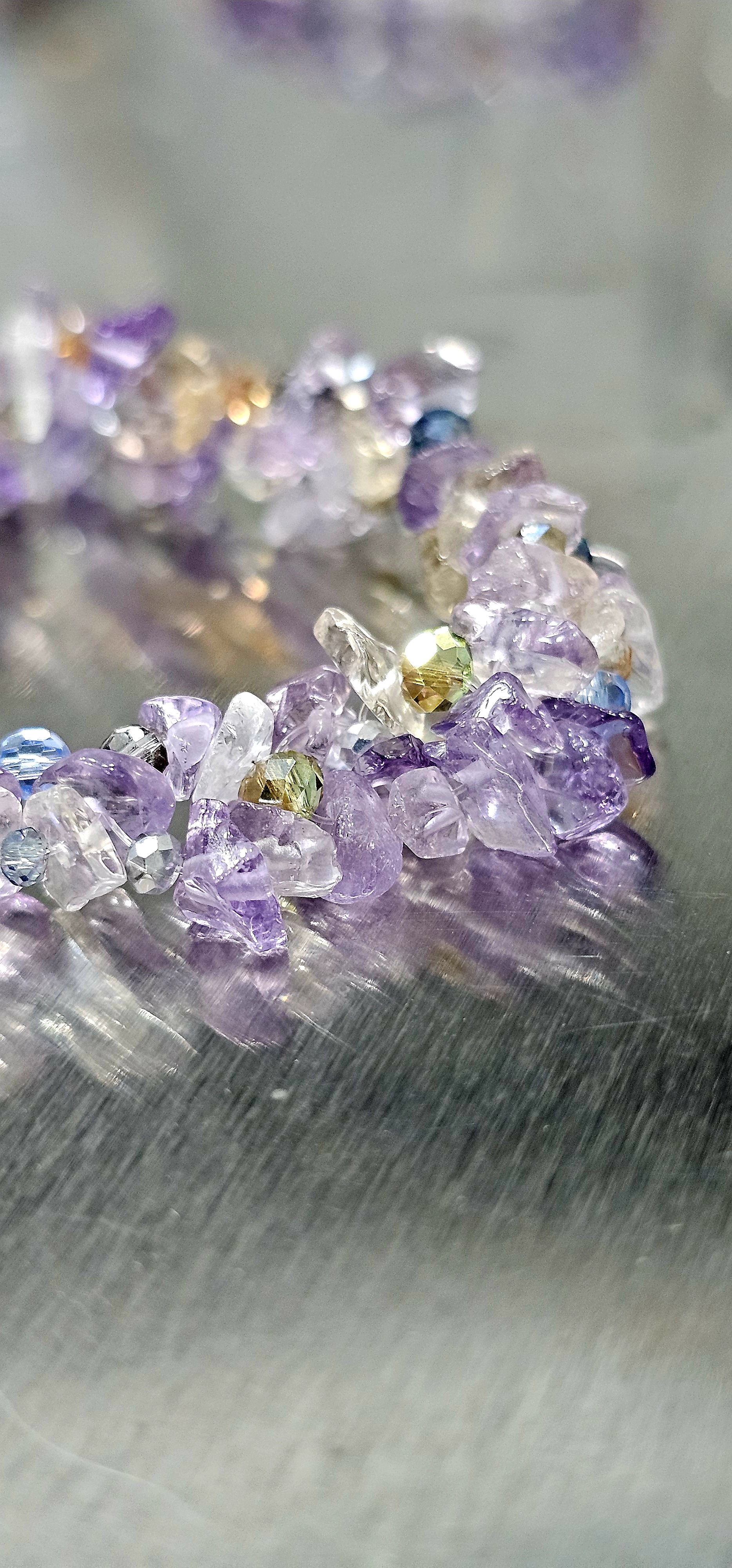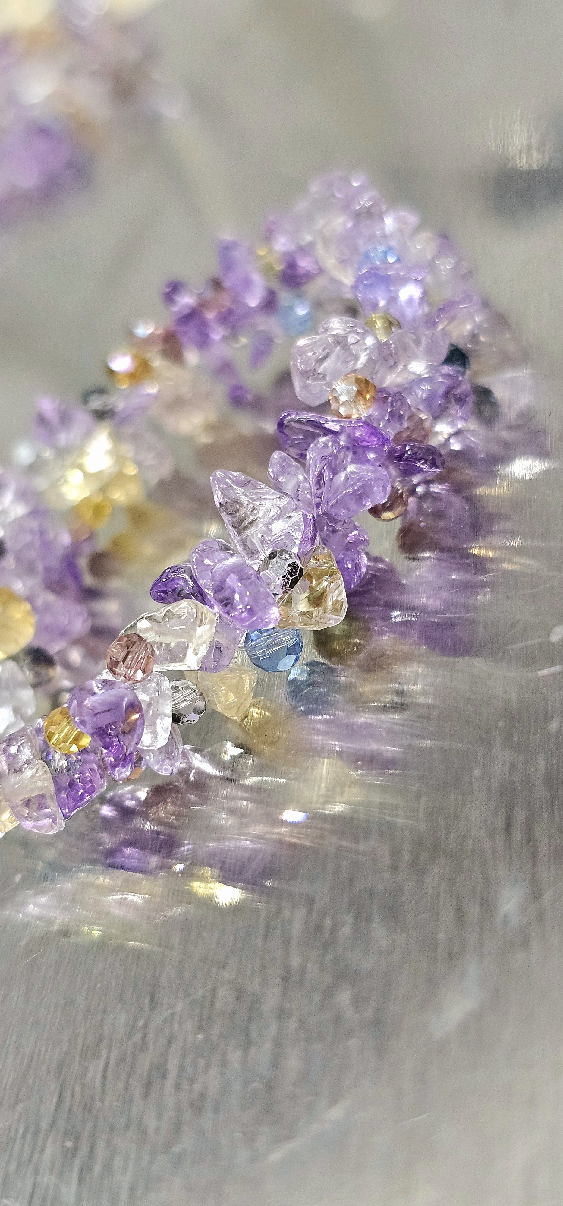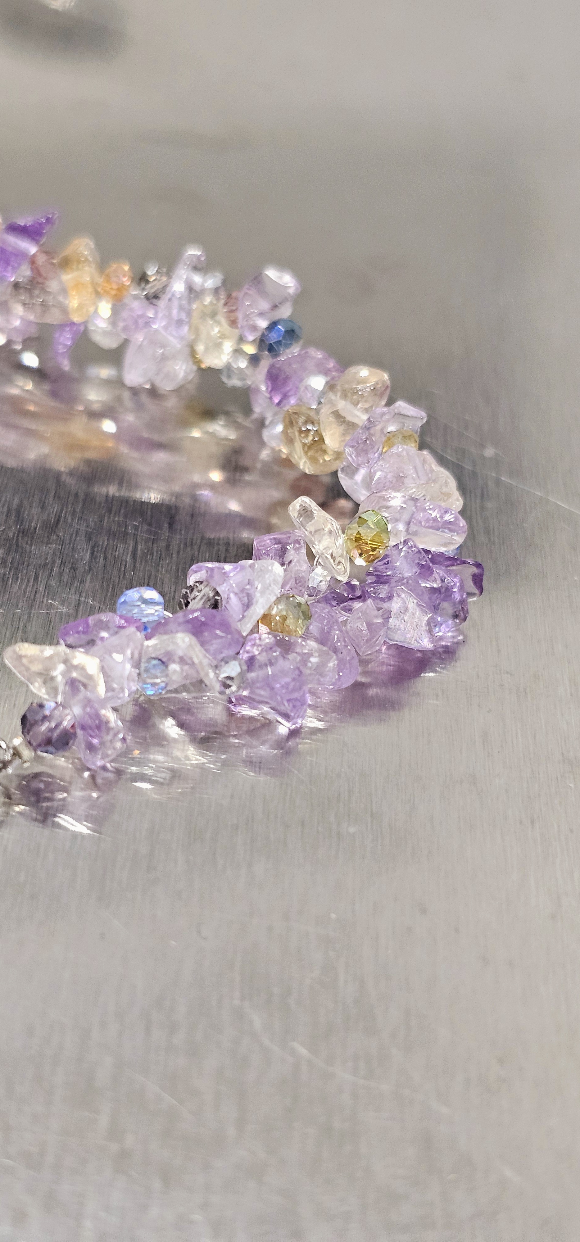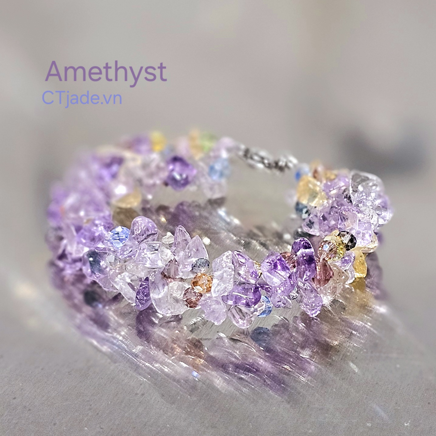 Một bản phối tuyệt đẹp của Thạch anh tím và pha lê. Chất lượng những mảnh nhỏ đá Ametrine rất trong trẻo, sáng đẹp, việc chọn các mảnh ghép tạo dáng như những cánh hoa làm cho chiếc vòng trở nên độc đáo và mang tính mỹ thuật cao.