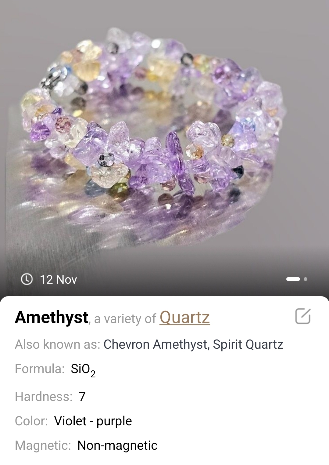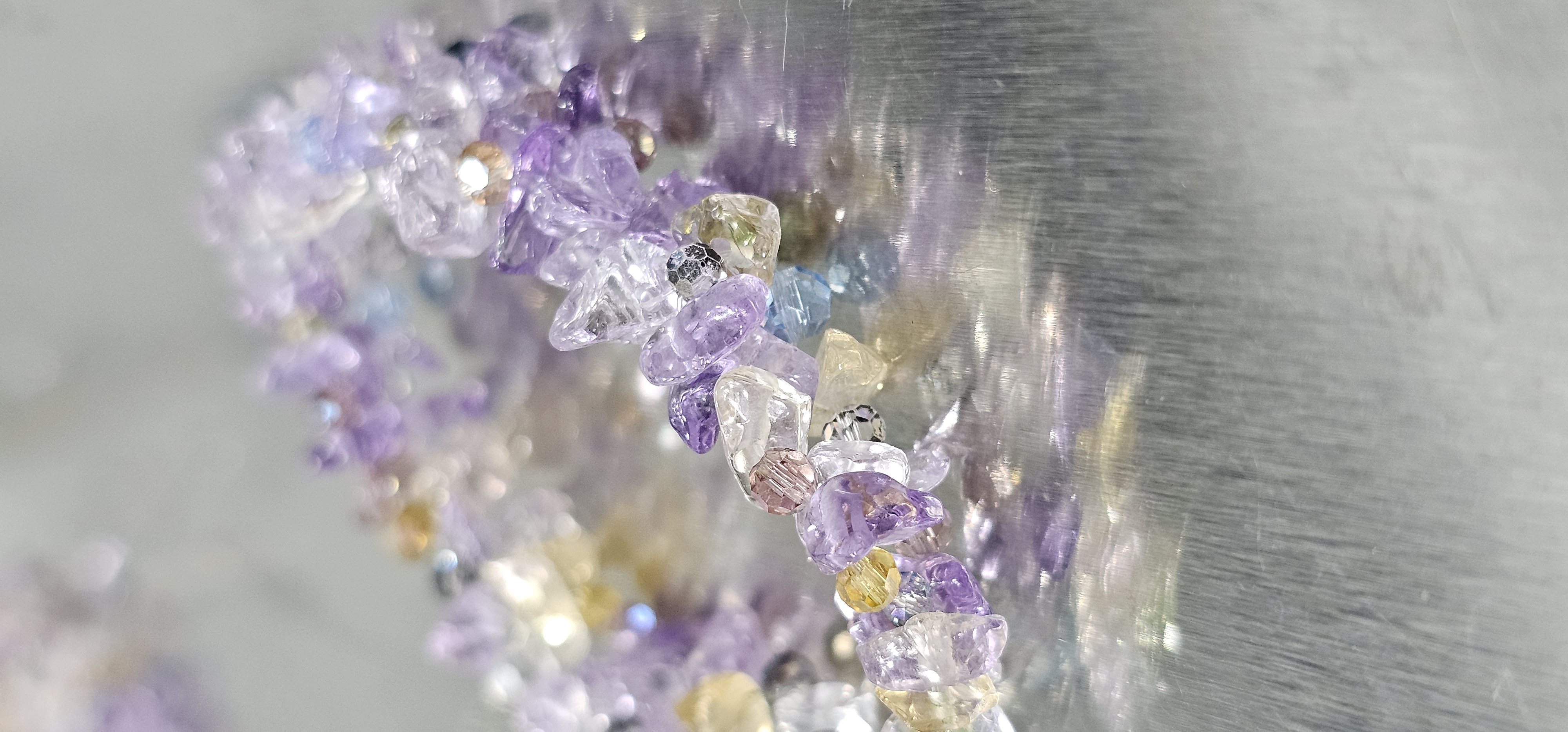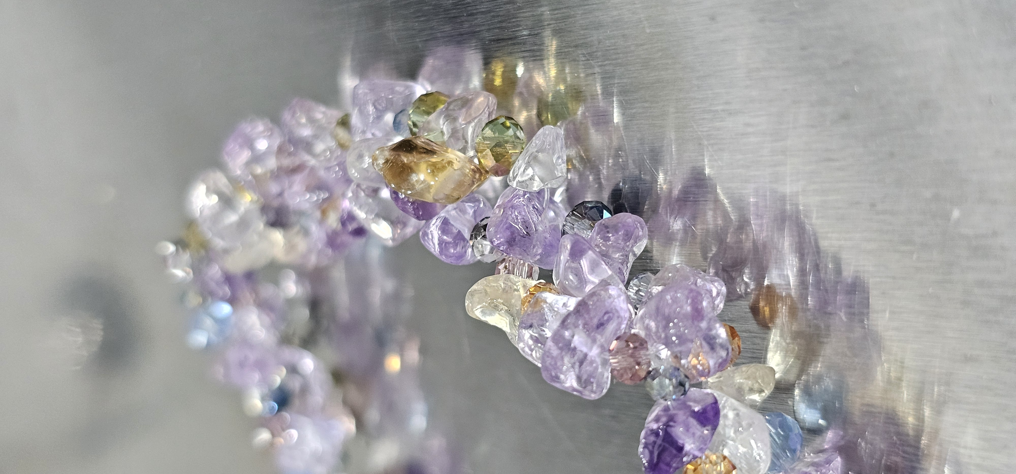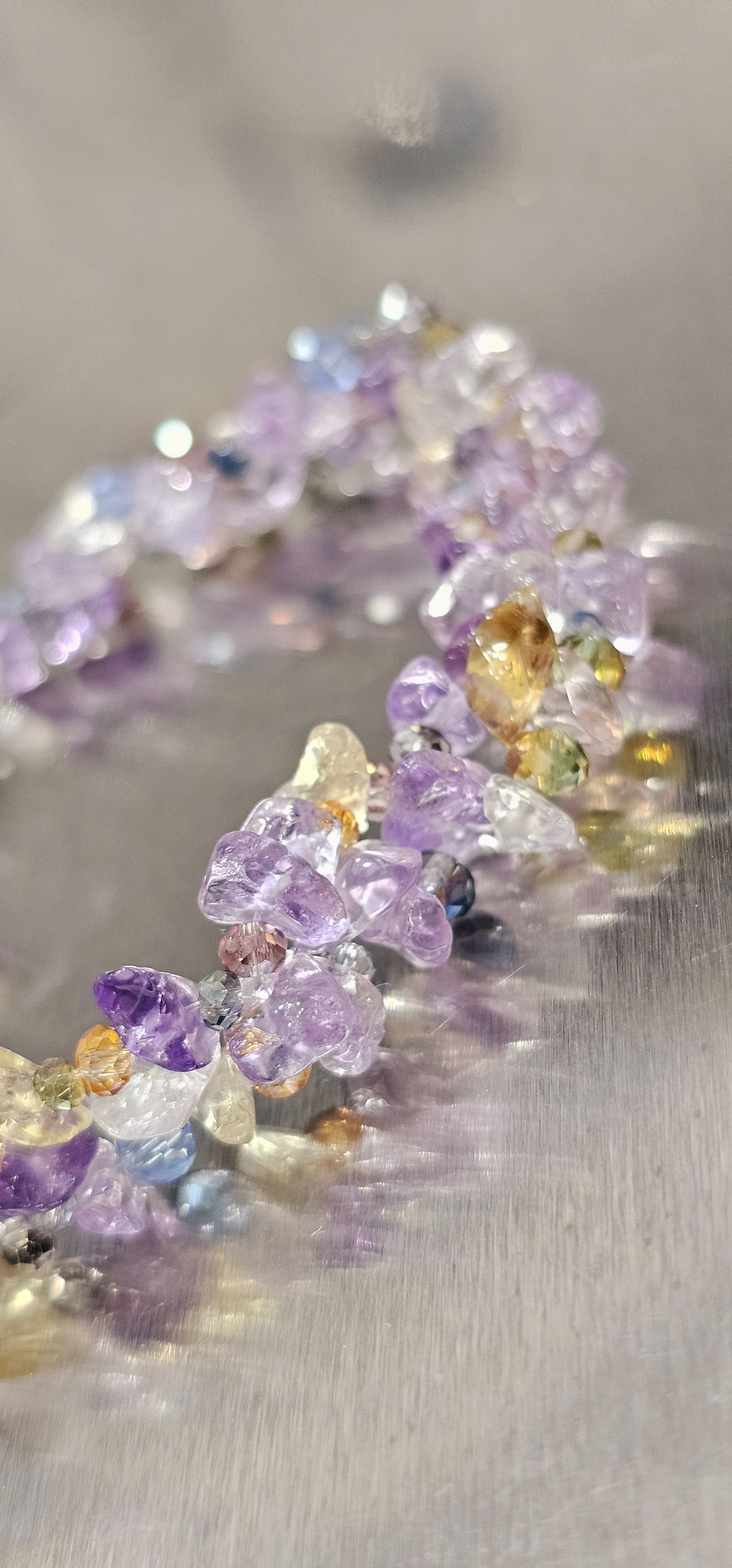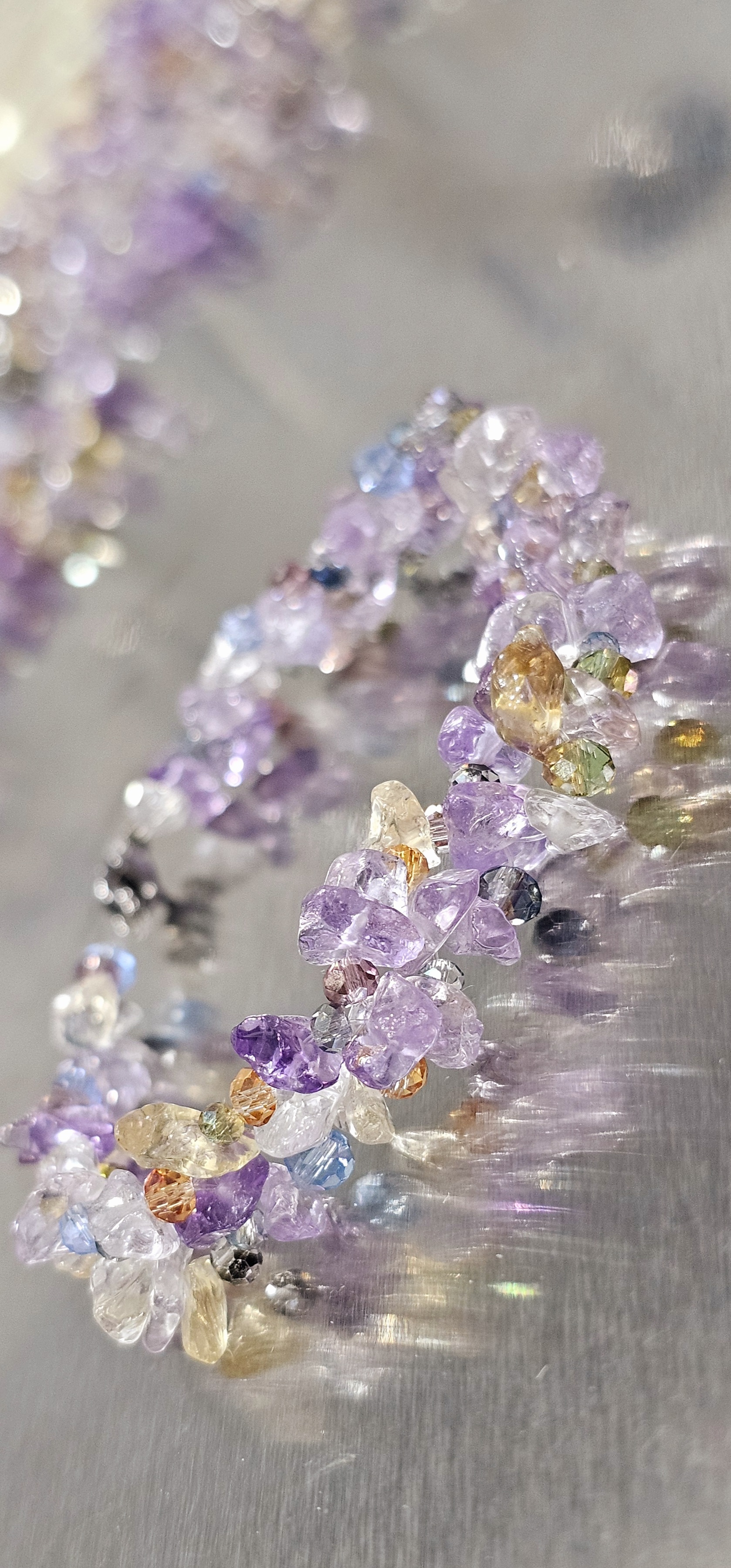 Một bản phối tuyệt đẹp của Thạch anh tím và pha lê. Chất lượng những mảnh nhỏ đá Ametrine rất trong trẻo, sáng đẹp, việc chọn các mảnh ghép tạo dáng như những cánh hoa làm cho chiếc vòng trở nên độc đáo và mang tính mỹ thuật cao.