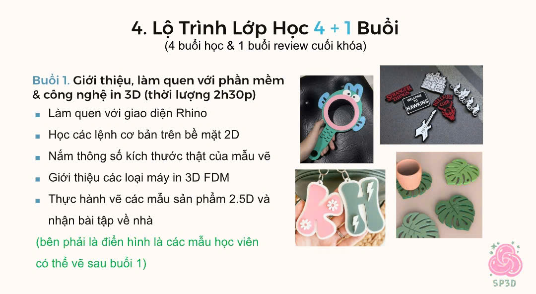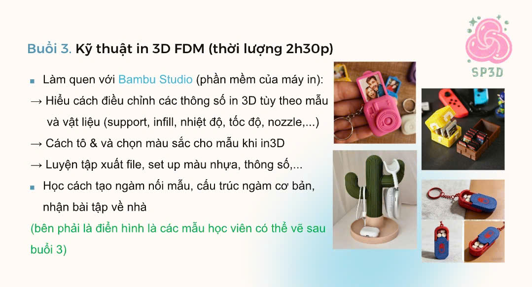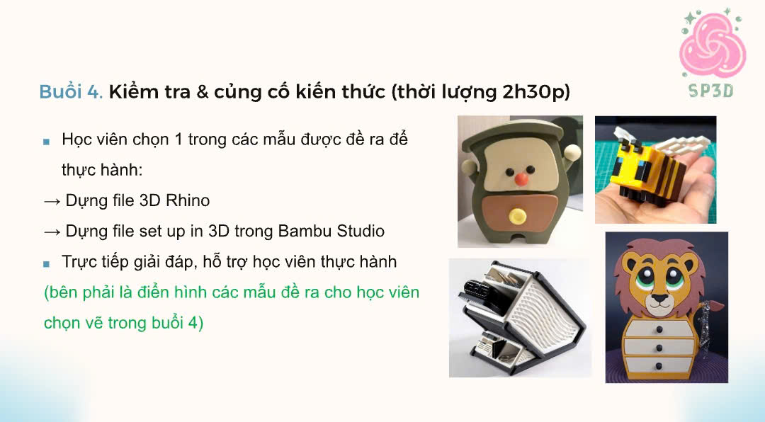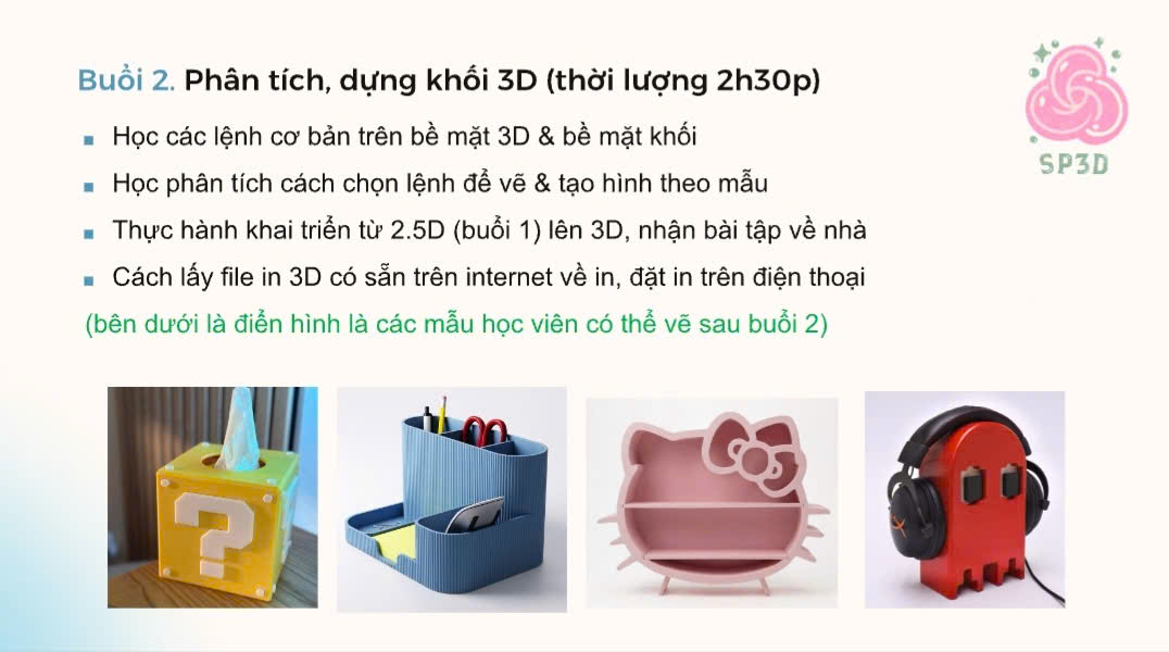 Từ việc làm quen phần mềm vẽ 3D đến cách tạo ra các khối hình đơn giản, rồi dần dần biến chúng thành một sản phẩm hoàn chỉnh có thể in ra thật.