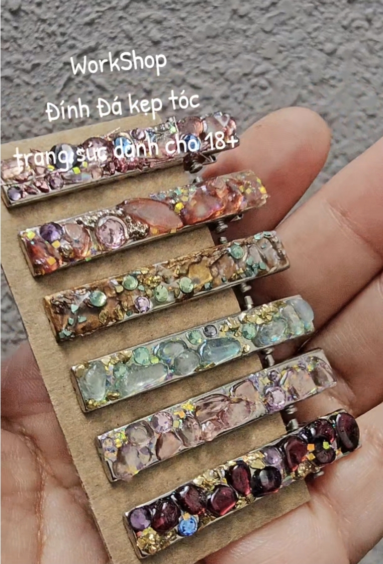 Workshop này có làm kẹp tóc, nhẫn và bông tai đính đá thiên nhiên, ngọc trai thiên nhiên, vẽ màu Acrylic, và phụ kiện trang trí để thỏa sức sáng tạo. Lớp này không dành cho trẻ.