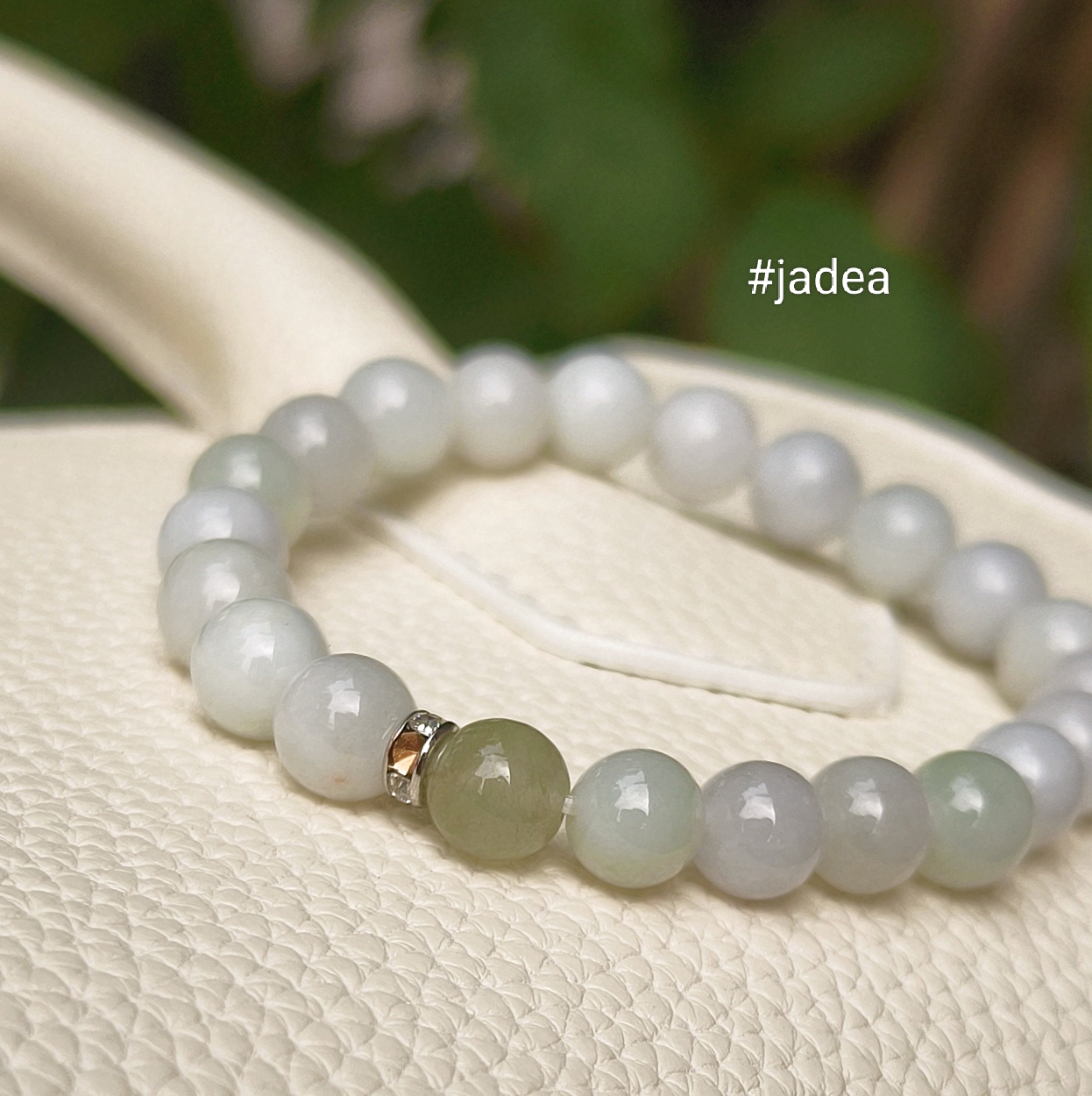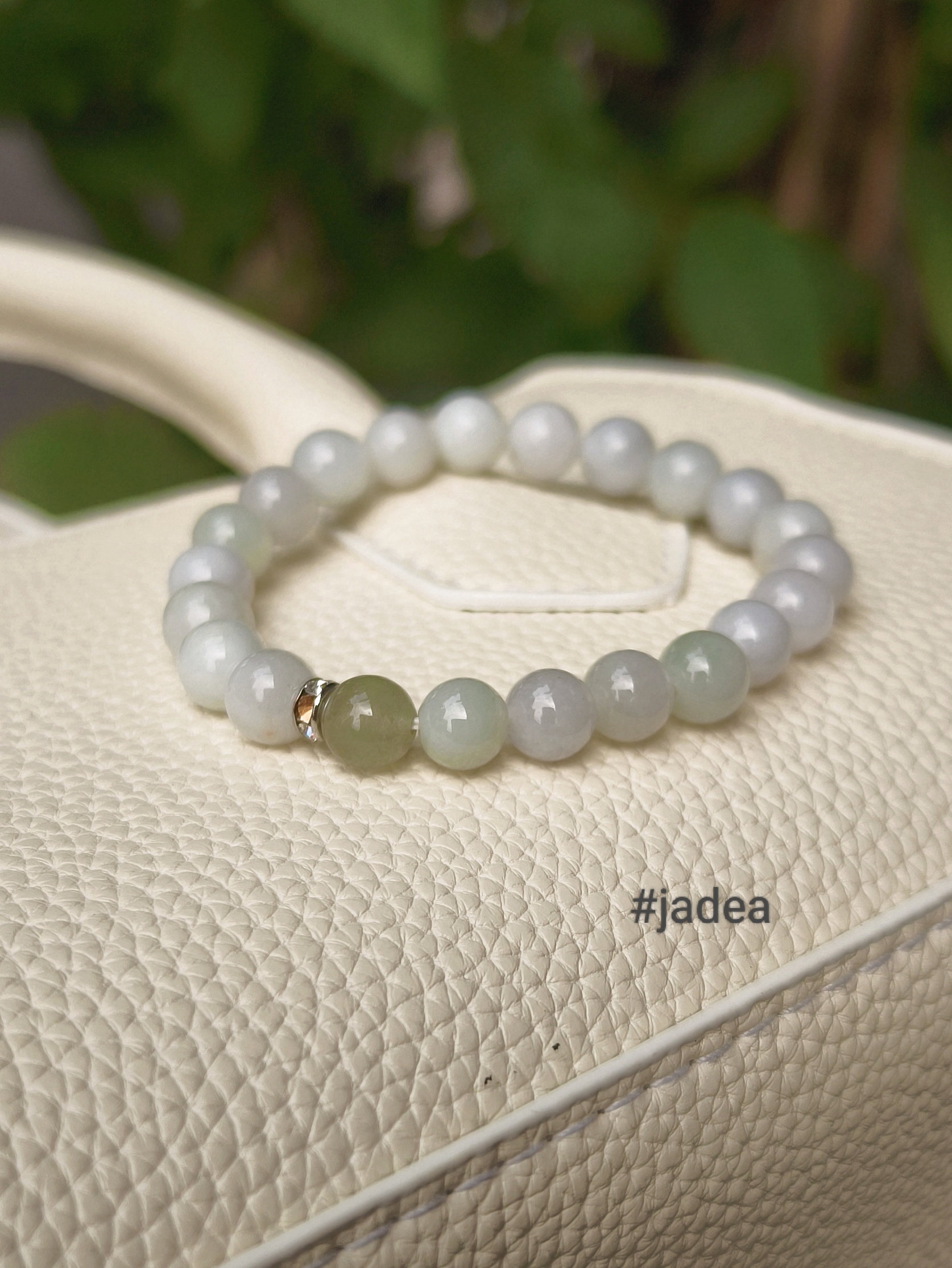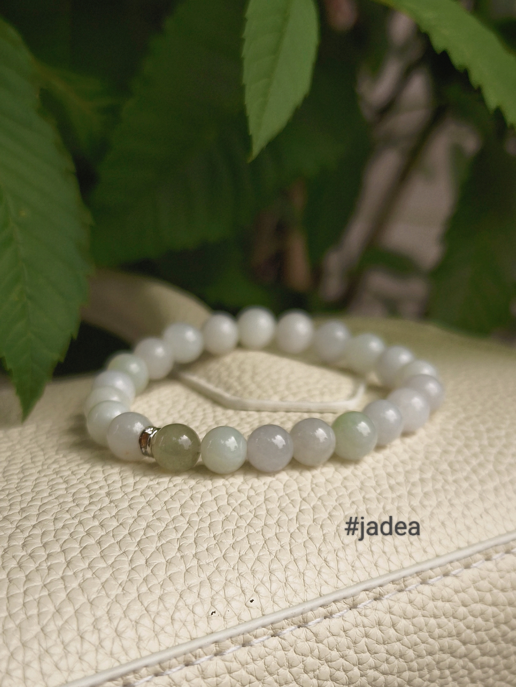 Bạch ngọc trong chiếc vòng không trắng gắt, không bóng lóa. Đó là sắc trắng của đá đã đi qua thời gian, trầm ổn và có chiều sâu, càng ngắm càng thấy dịu. Xen giữa là một hạt cẩm thạch xanh nhạt làm điểm nhấn, vừa đủ để tạo nét khác biệt mà vẫn giữ trọn sự hài hòa tổng thể.
