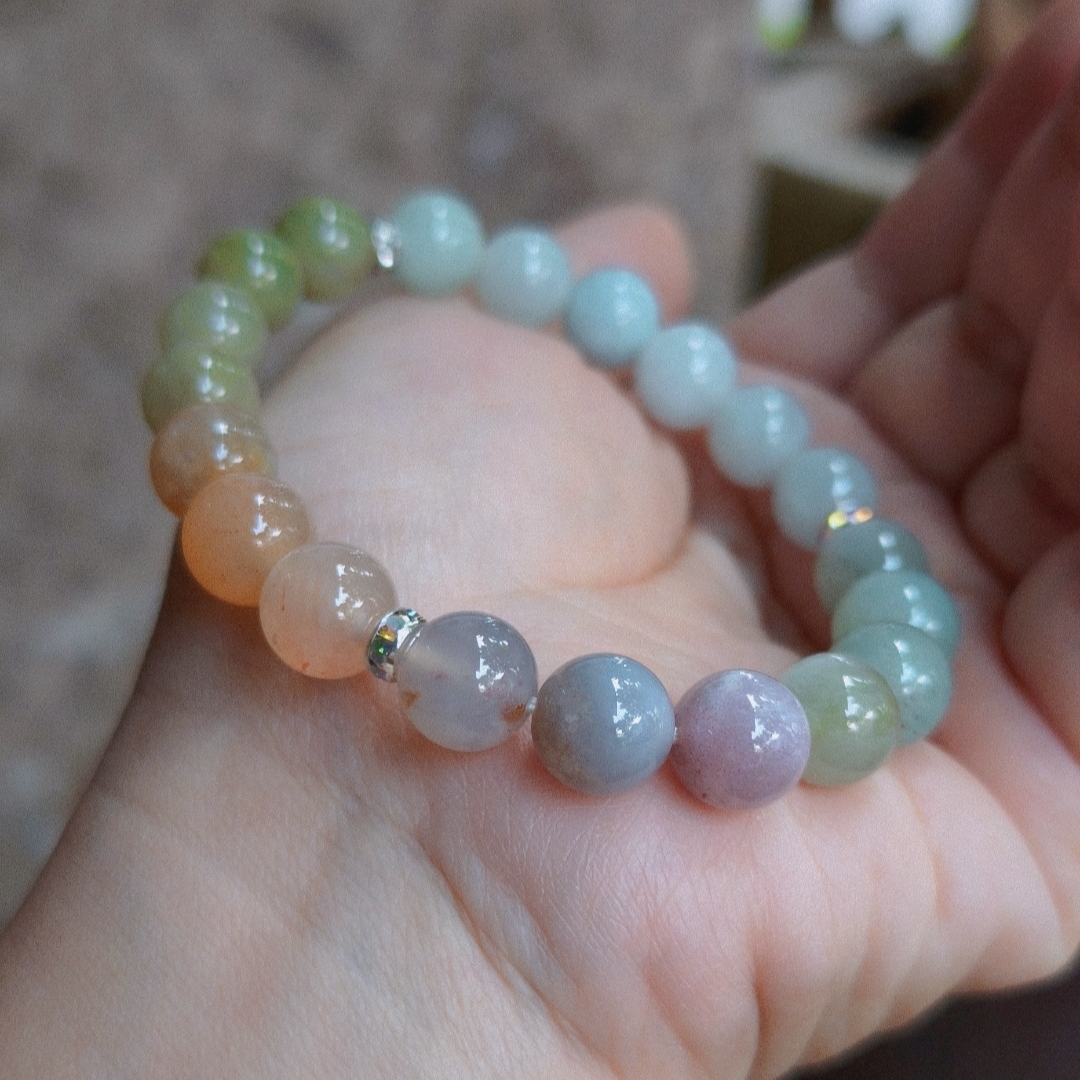 Chiếc vòng phối những viên đá tông pastel tự nhiên – xanh ngọc, xanh non, hồng phấn, xám sương và chút nắng mật ong.