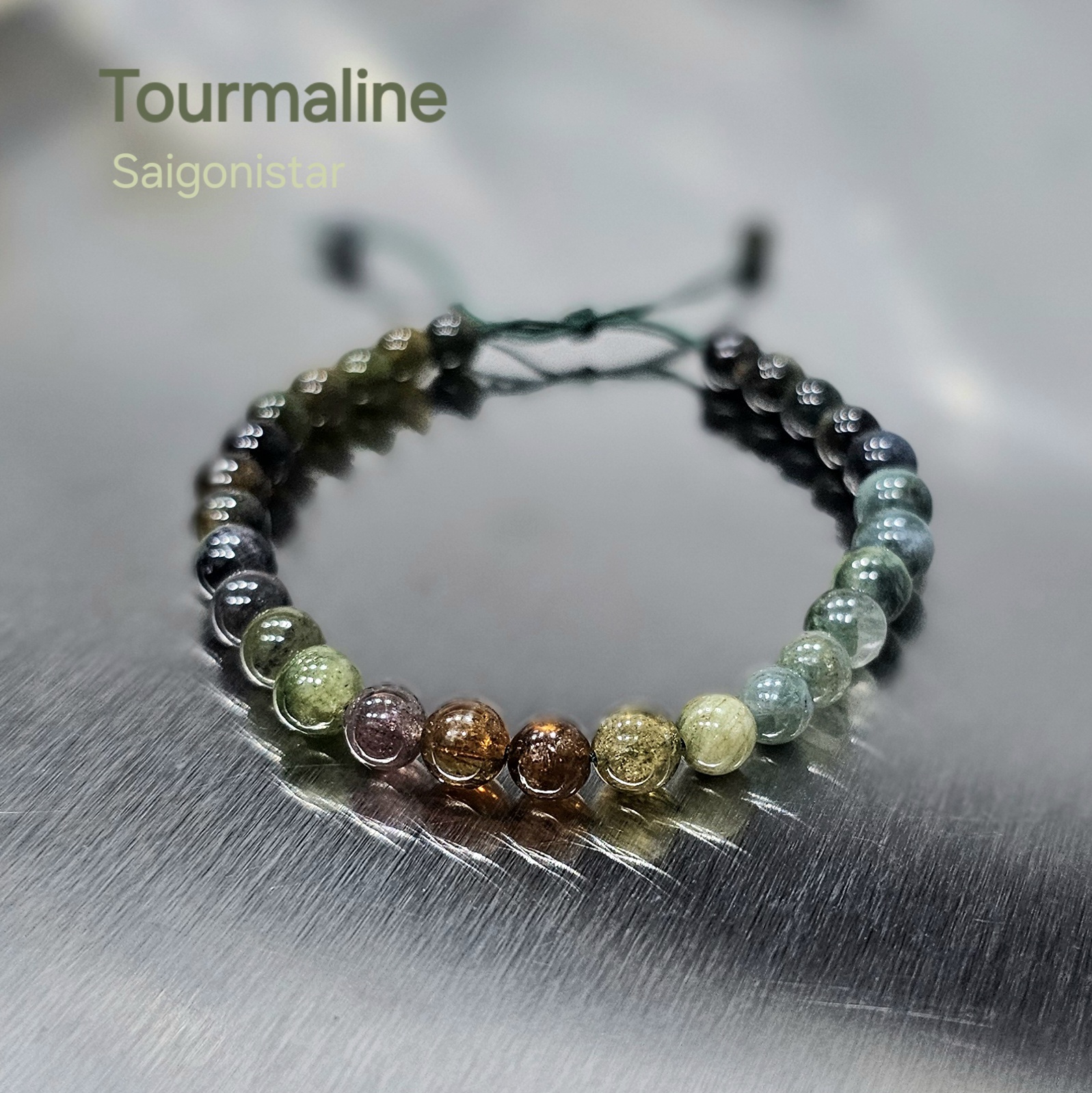 Chiếc vòng tay đá Tourmaline này gồm 30 viên đá 5ly có sắc thái chuyển tông rất ấn tượng: