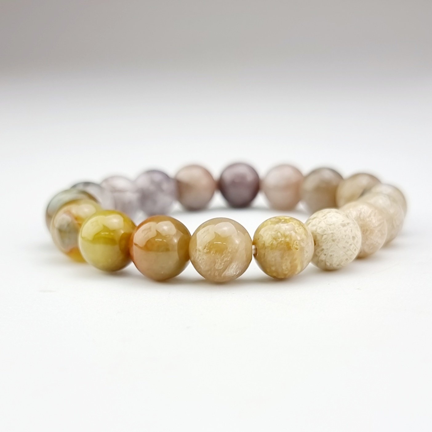 Chiếc vòng được phối đá San Hô hóa thạch, gỗ hóa thạch và vài viên Jasper Madagasca mang trong mình vẻ đẹp tuyệt vời và độc đáo! Sắc đá San Hô màu vàng nhạt của nắng tạo nên một cảm giác dịu dàng và tươi sáng. Với vân san hô đặc trưng, chiếc vòng này như một mảnh trời trong mát, với cảm xúc thanh bình và tĩnh tại.