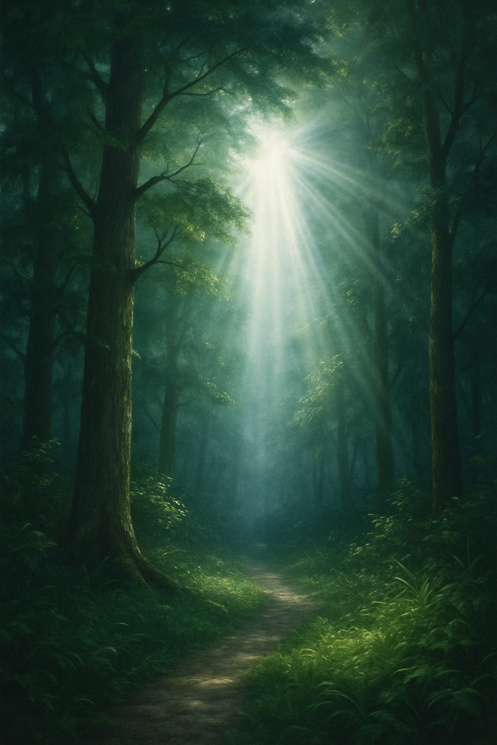 Trong khu rừng sâu thẳm, nơi bóng tối và sự tĩnh lặng bao trùm, ánh sáng là phép màu duy nhất đánh thức mọi sự sống. Chỉ một tia sáng trắng xuyên qua tán lá, chạm đến mặt đất, cũng đủ làm những mầm non vươn lên, những chiếc lá khẽ rung, và cả không gian bừng tỉnh.