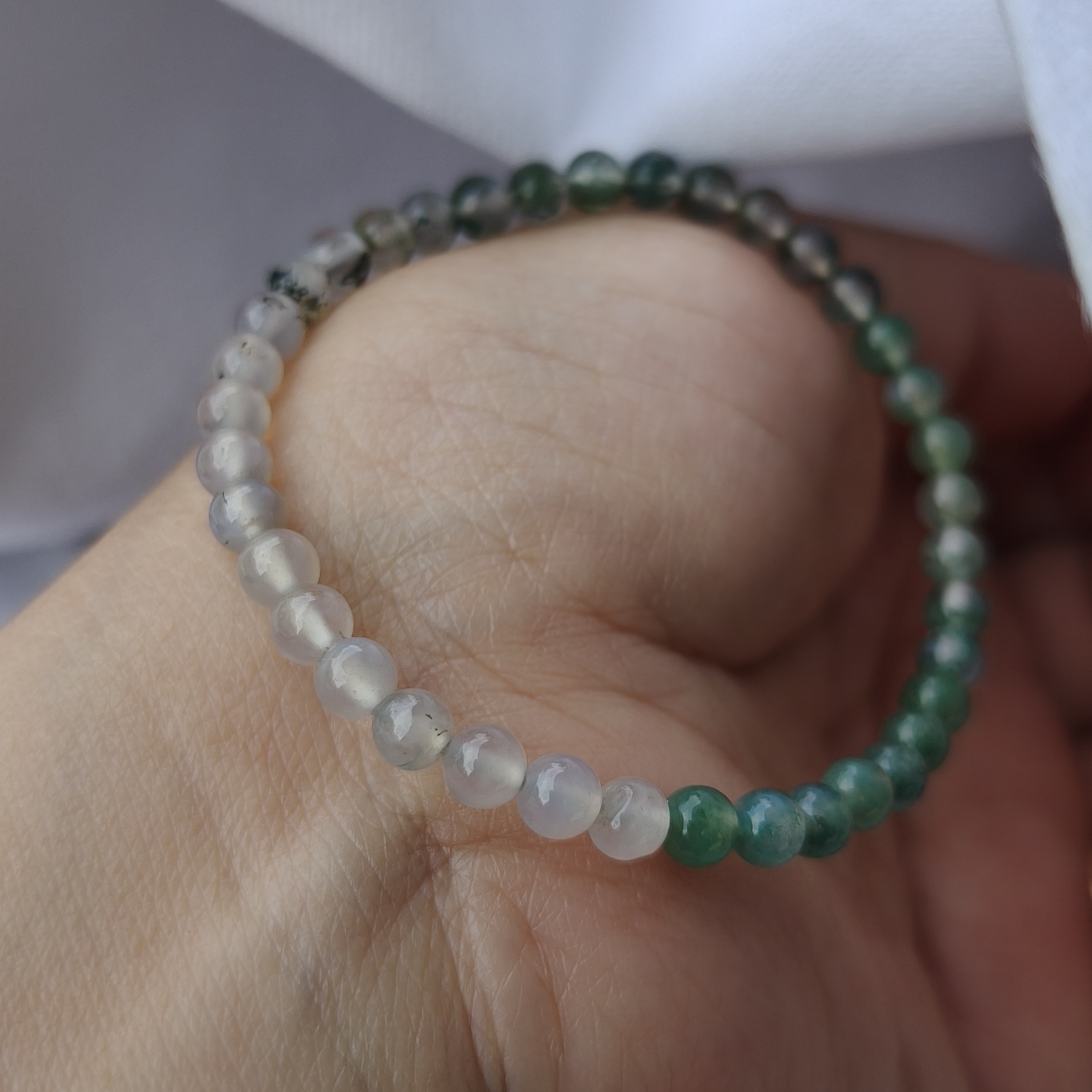 Chiếc vòng Mã Não Trắng & Moss Agate cũng mang trong mình tinh thần ấy – Mã Não Trắng như nguồn sáng thanh khiết, xua tan u tối trong tâm trí, khai mở những vùng năng lượng mới. Moss Agate xanh rêu là sắc màu của sự sinh trưởng, kết nối bạn với mạch sống bền bỉ của đất mẹ.