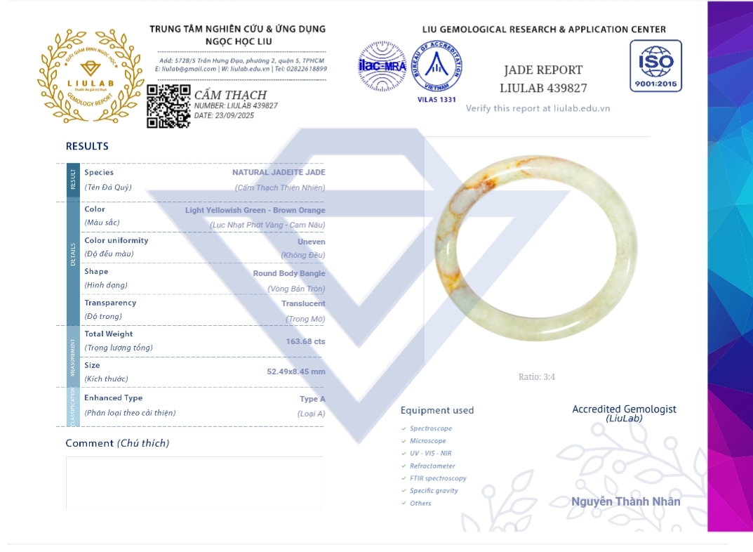 Chiếc vòng này lên hoàng phỉ loang rộng nửa cung vòng trên nền xanh lục nhẹ rất hài hòa tông sắc.