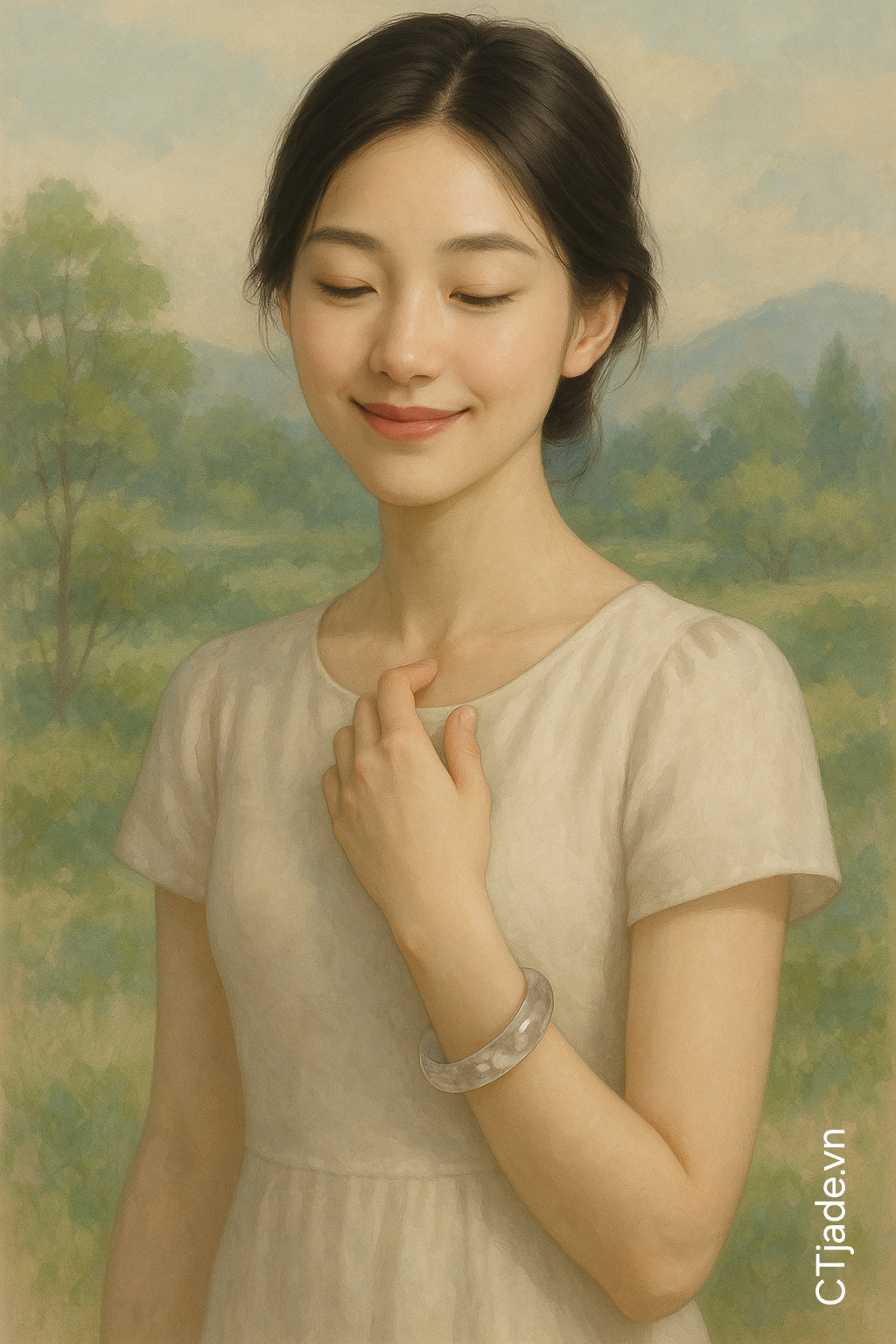 🌸 Phong cách: Thiết kế bản tròn truyền thống, độ trong mát mắt và đường vân mềm mại khiến chiếc vòng càng trở nên nữ tính và sang trọng