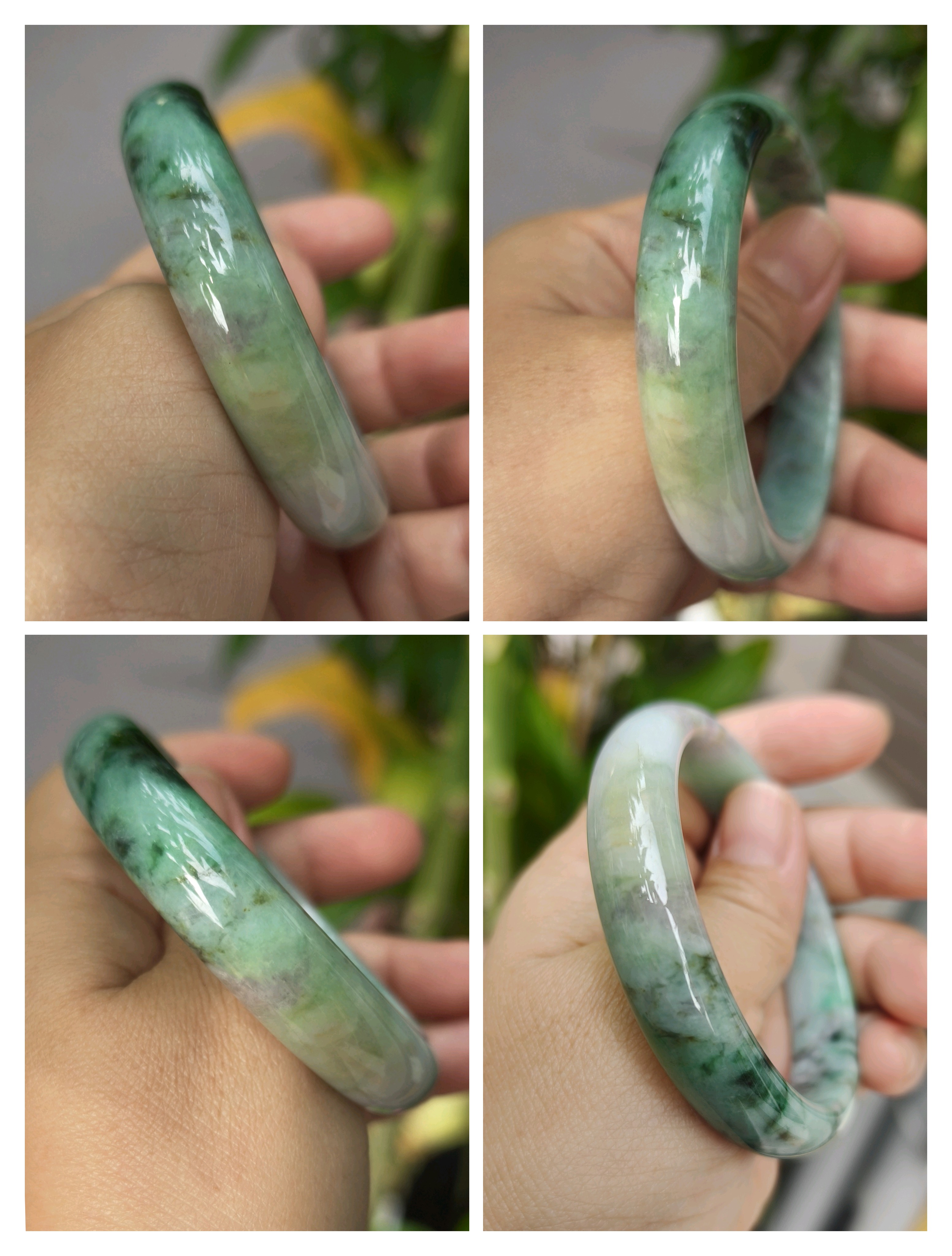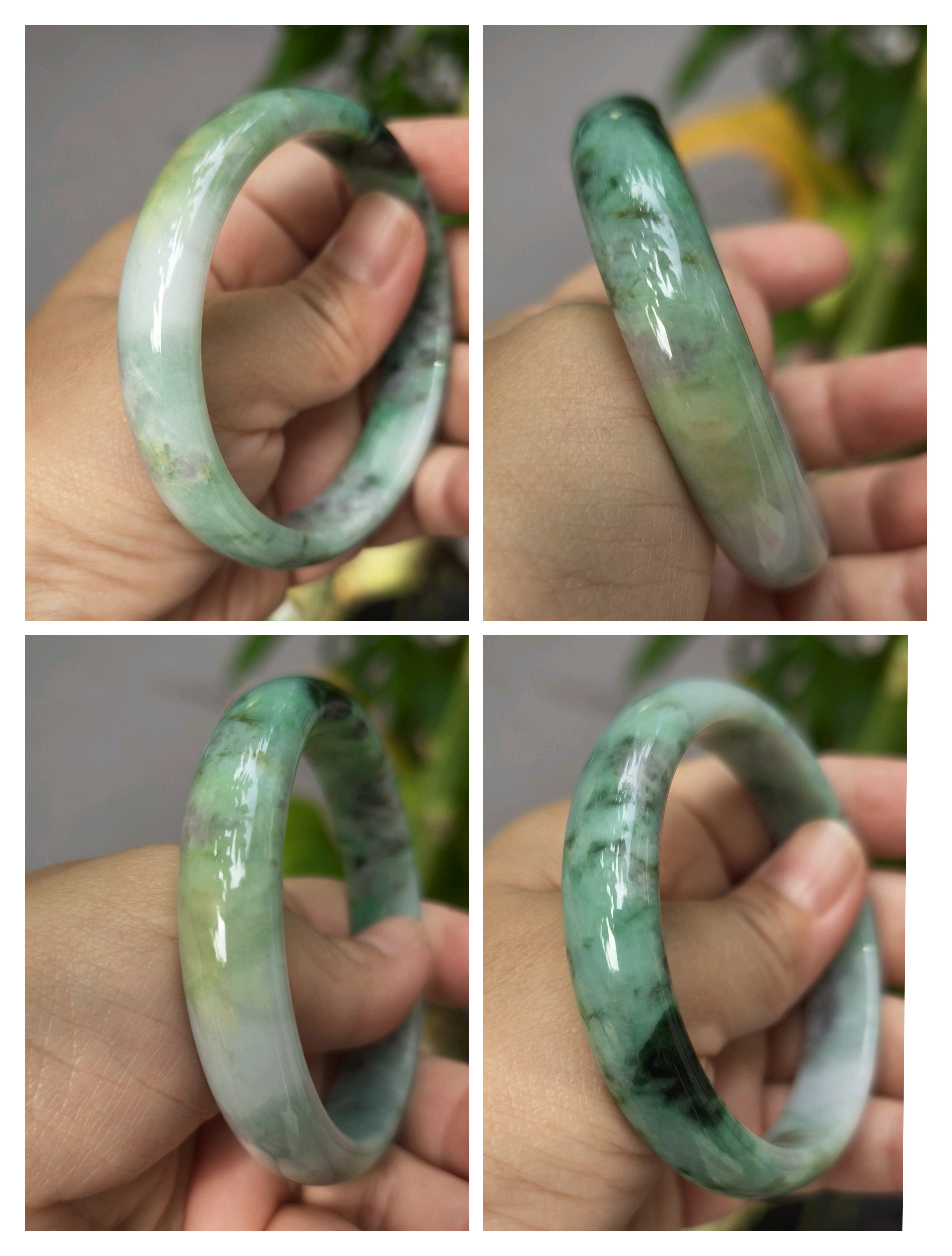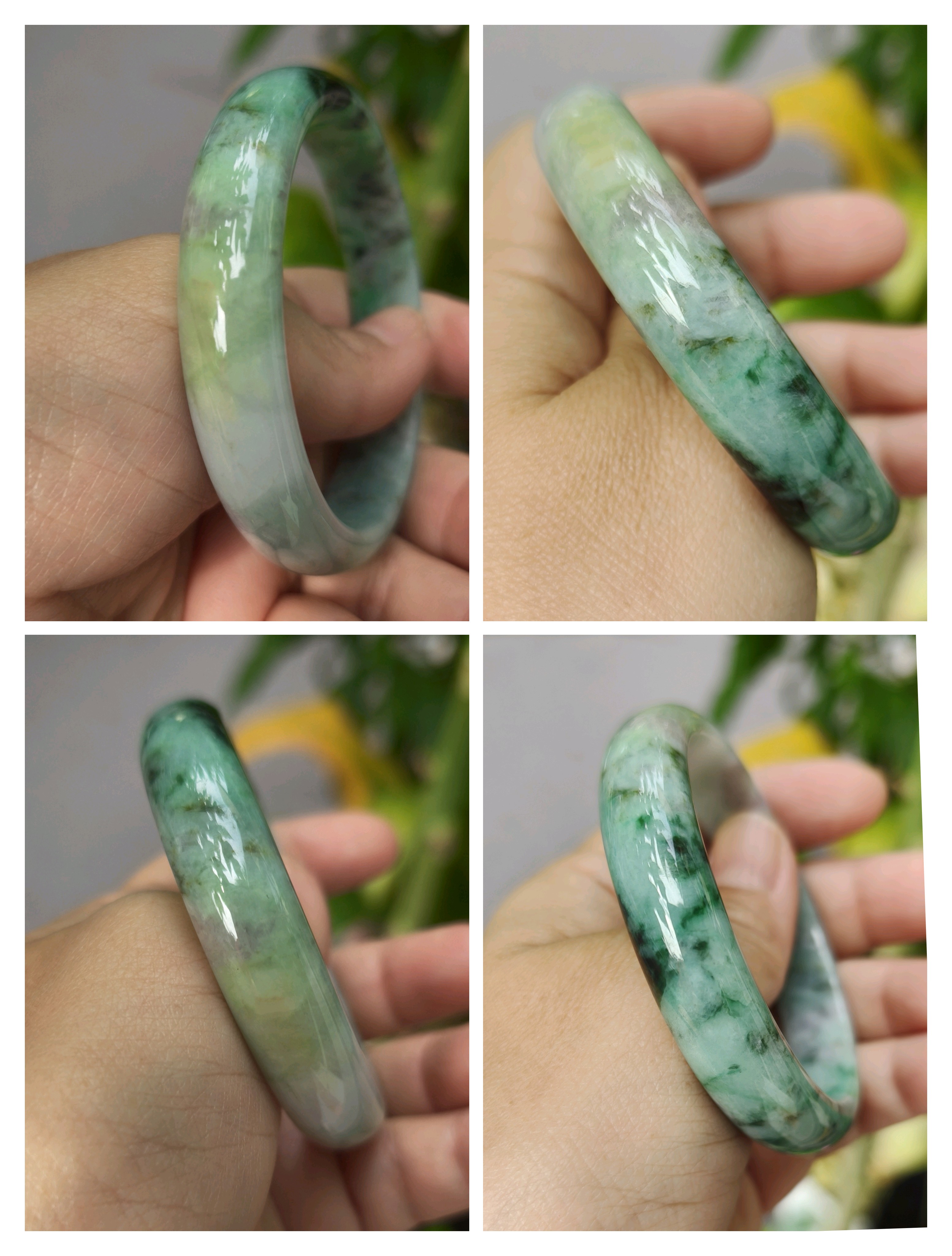 Chiếc vòng trong ảnh là vòng cẩm thạch thiên nhiên pha sắc lục vàng đất – tông màu trầm ấm, cổ điển và rất hiếm.