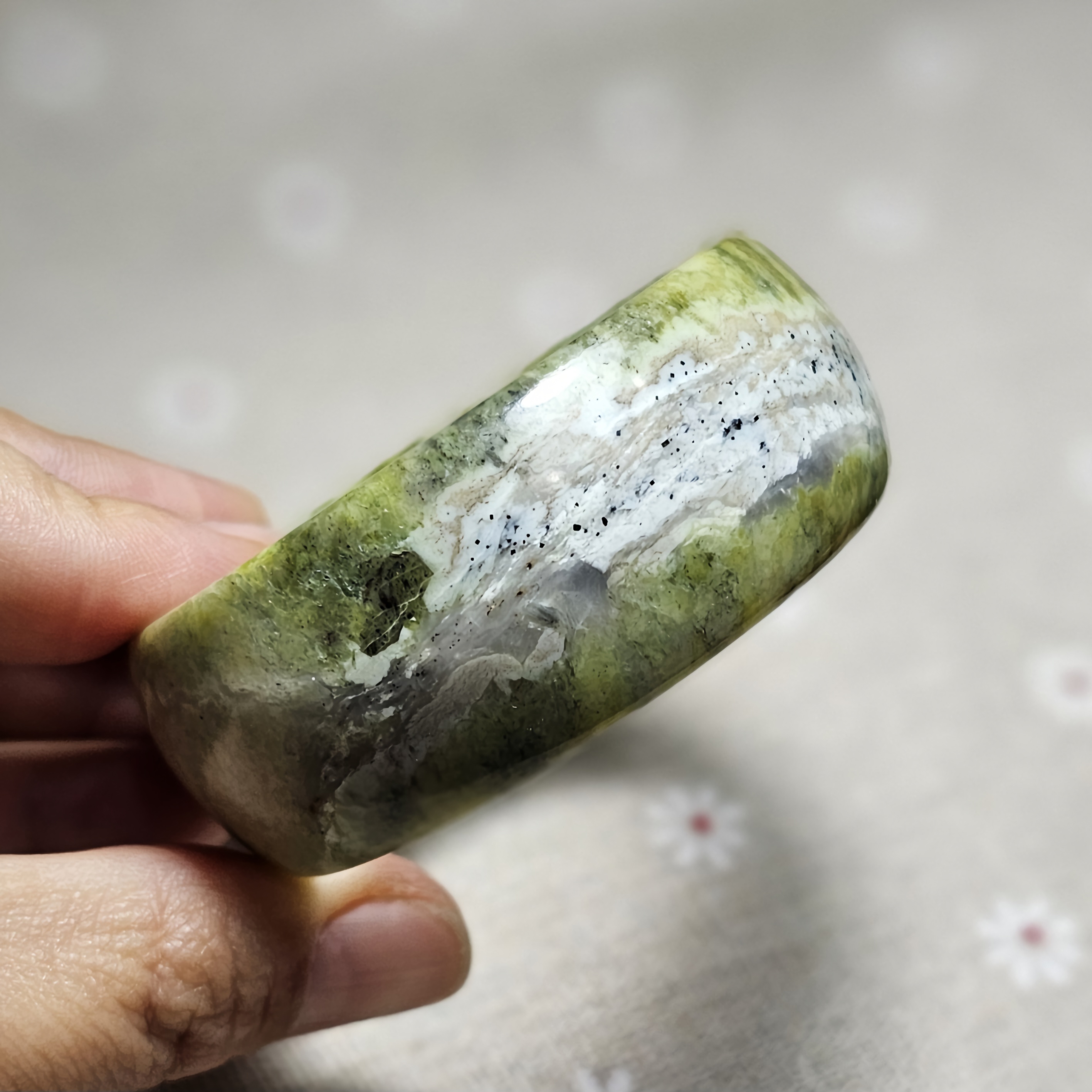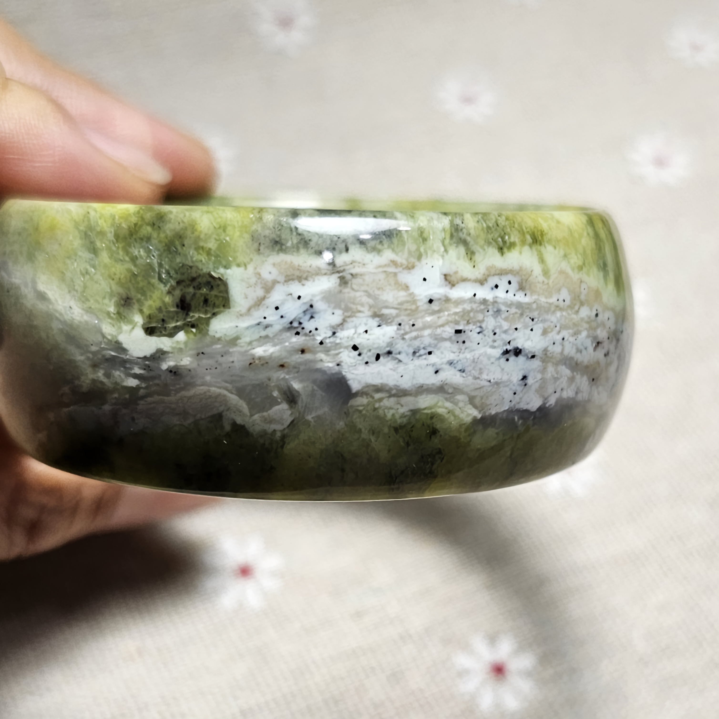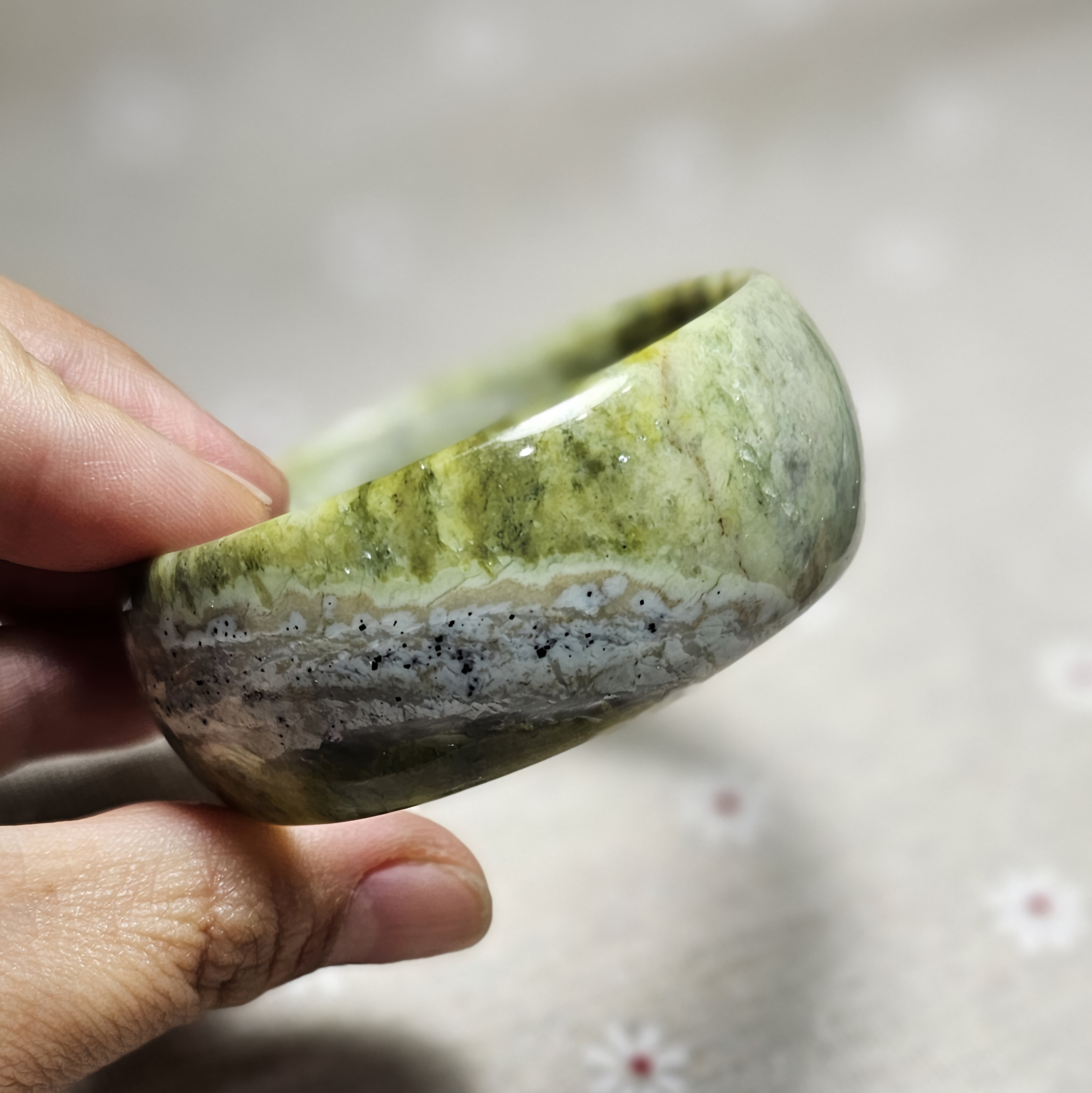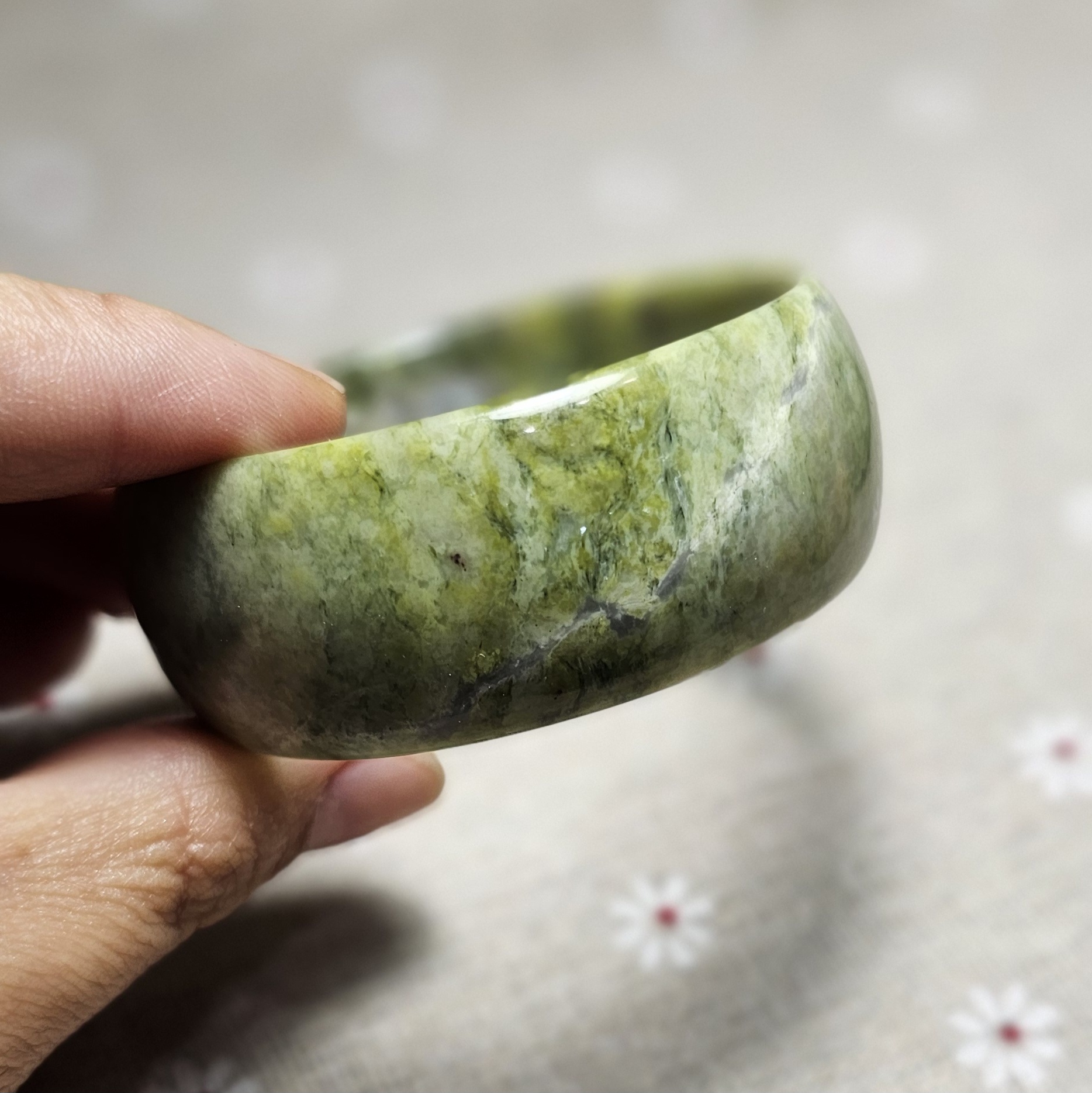 Vòng tay đá Serpentine thiên nhiên 100%, - Viên đá chế tác thủ công 100% bởi thế không bóng đẹp bằng các quy trình đánh bóng bằng máy móc. Thế nhưng mình muốn ủng hộ người thợ đá cần mẫn VN, họ không thể cạnh tranh với chất lượng đầu ra như máy móc làm, phải lâu hơn và cực công hơn rất nhiều, cố duy trì để kiếm sống bằng lao động thủ công. Tuy nhiên chất đá tuyệt đẹp này sẽ lên nước, bóng đẹp khá nhanh khi thường xuyên đeo