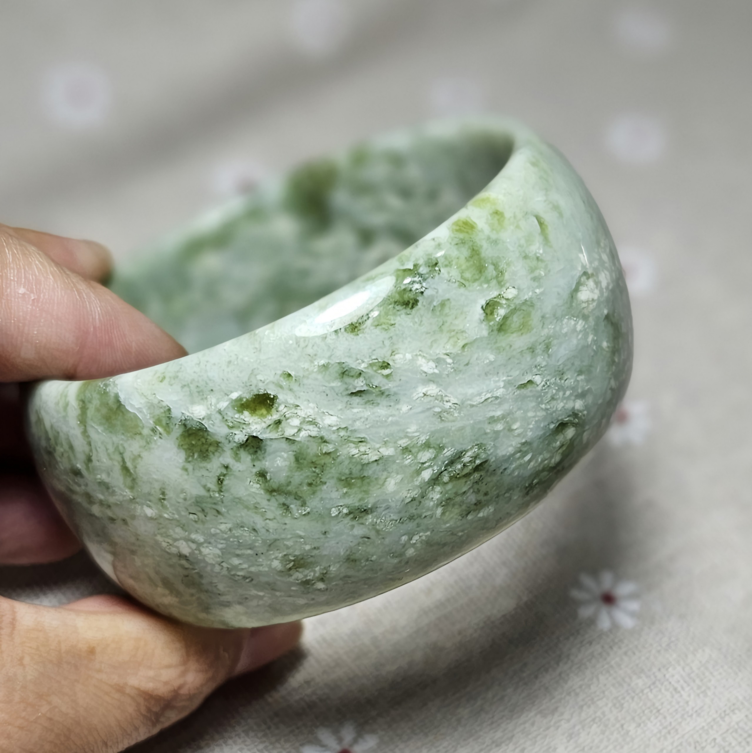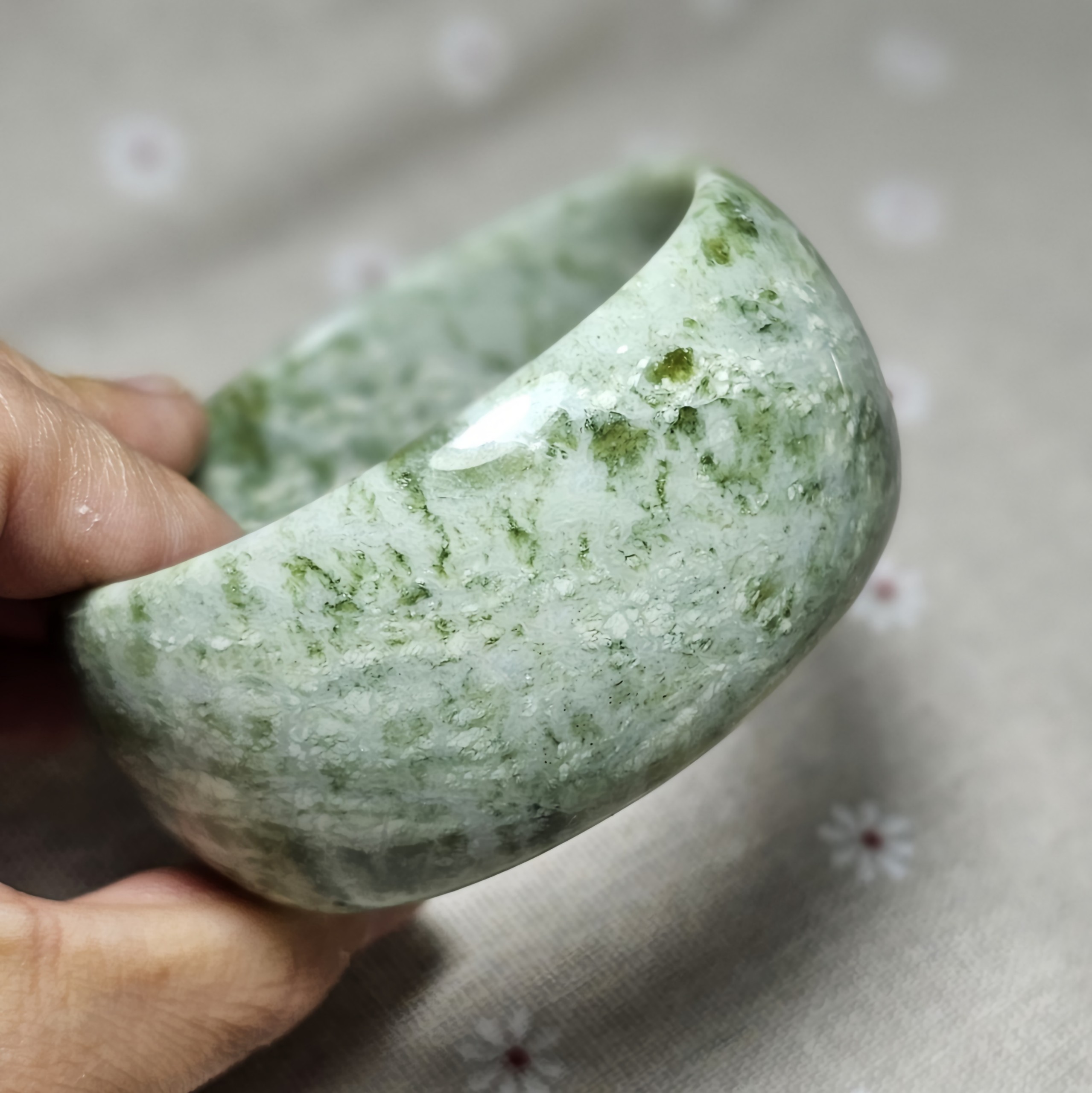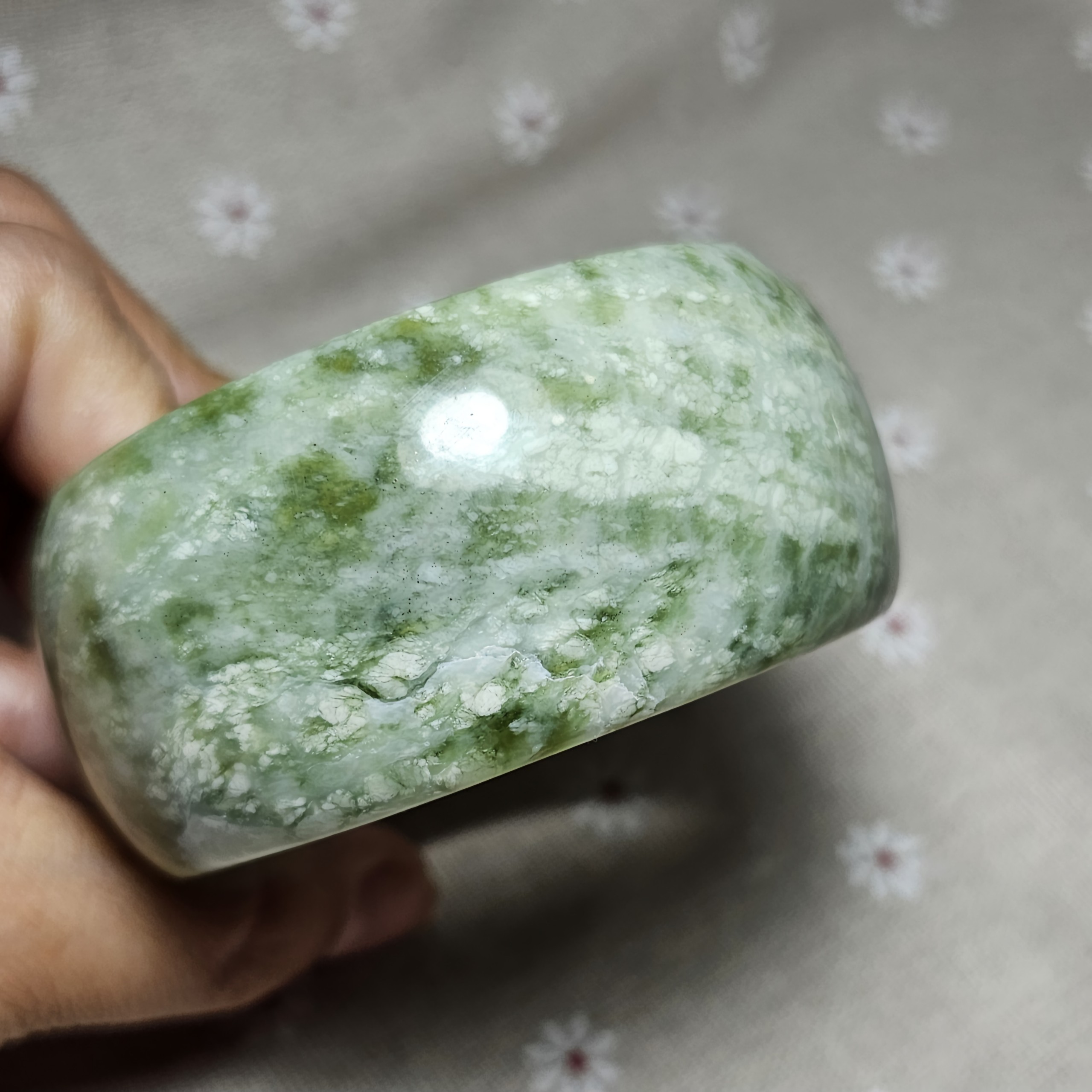 Vòng tay đá Serpentine thiên nhiên 100%, - Viên đá chế tác thủ công 100% bởi thế không bóng đẹp bằng các quy trình đánh bóng bằng máy móc. Thế nhưng mình muốn ủng hộ người thợ đá cần mẫn VN, họ không thể cạnh tranh với chất lượng đầu ra như máy móc làm, phải lâu hơn và cực công hơn rất nhiều, cố duy trì để kiếm sống bằng lao động thủ công. Tuy nhiên chất đá tuyệt đẹp này sẽ lên nước, bóng đẹp khá nhanh khi thường xuyên đeo