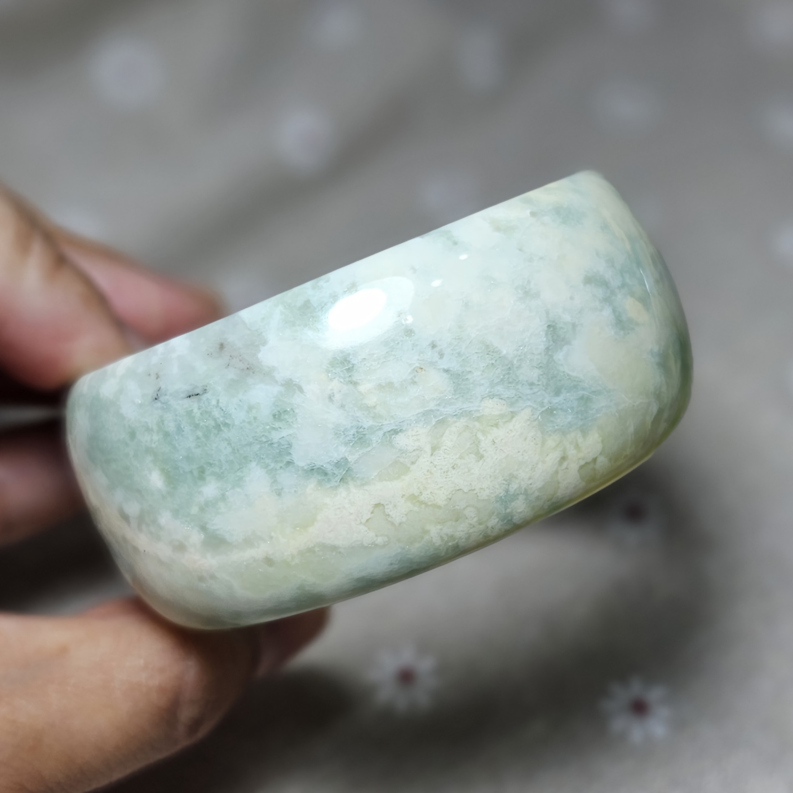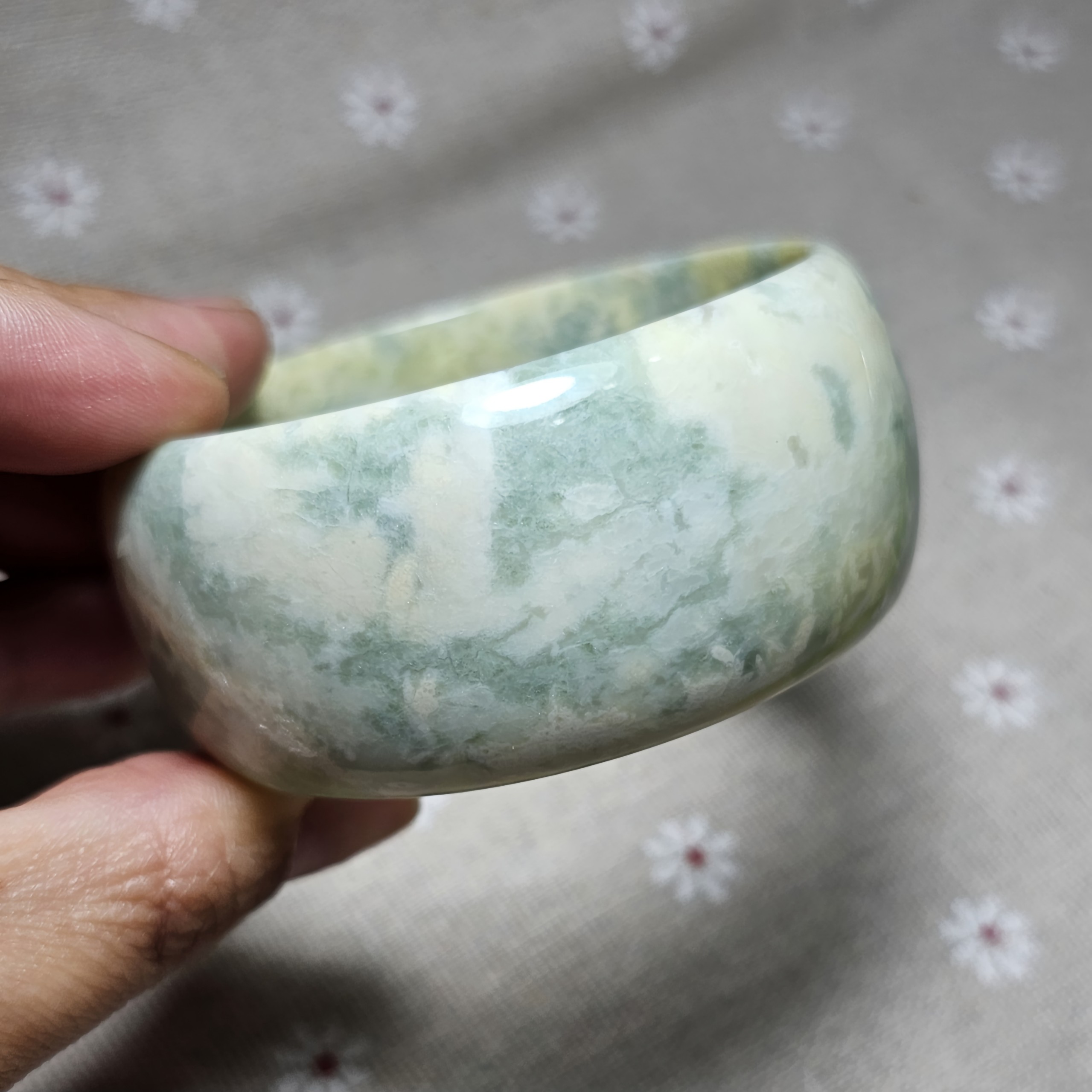 Vòng tay đá Serpentine thiên nhiên 100%, - Viên đá chế tác thủ công 100% bởi thế không bóng đẹp bằng các quy trình đánh bóng bằng máy móc. Thế nhưng mình muốn ủng hộ người thợ đá cần mẫn VN, họ không thể cạnh tranh với chất lượng đầu ra như máy móc làm, phải lâu hơn và cực công hơn rất nhiều, cố duy trì để kiếm sống bằng lao động thủ công. Tuy nhiên chất đá tuyệt đẹp này sẽ lên nước, bóng đẹp khá nhanh khi thường xuyên đeo