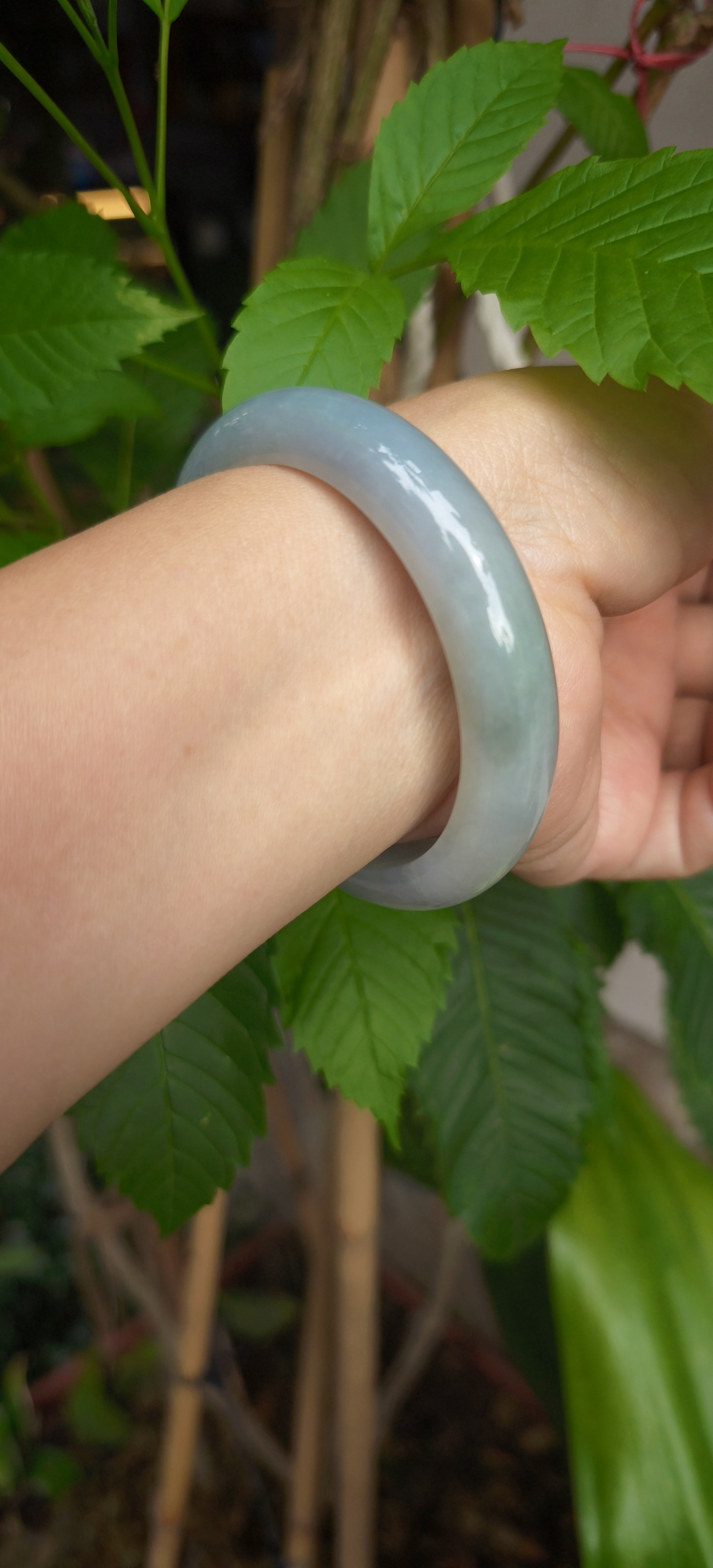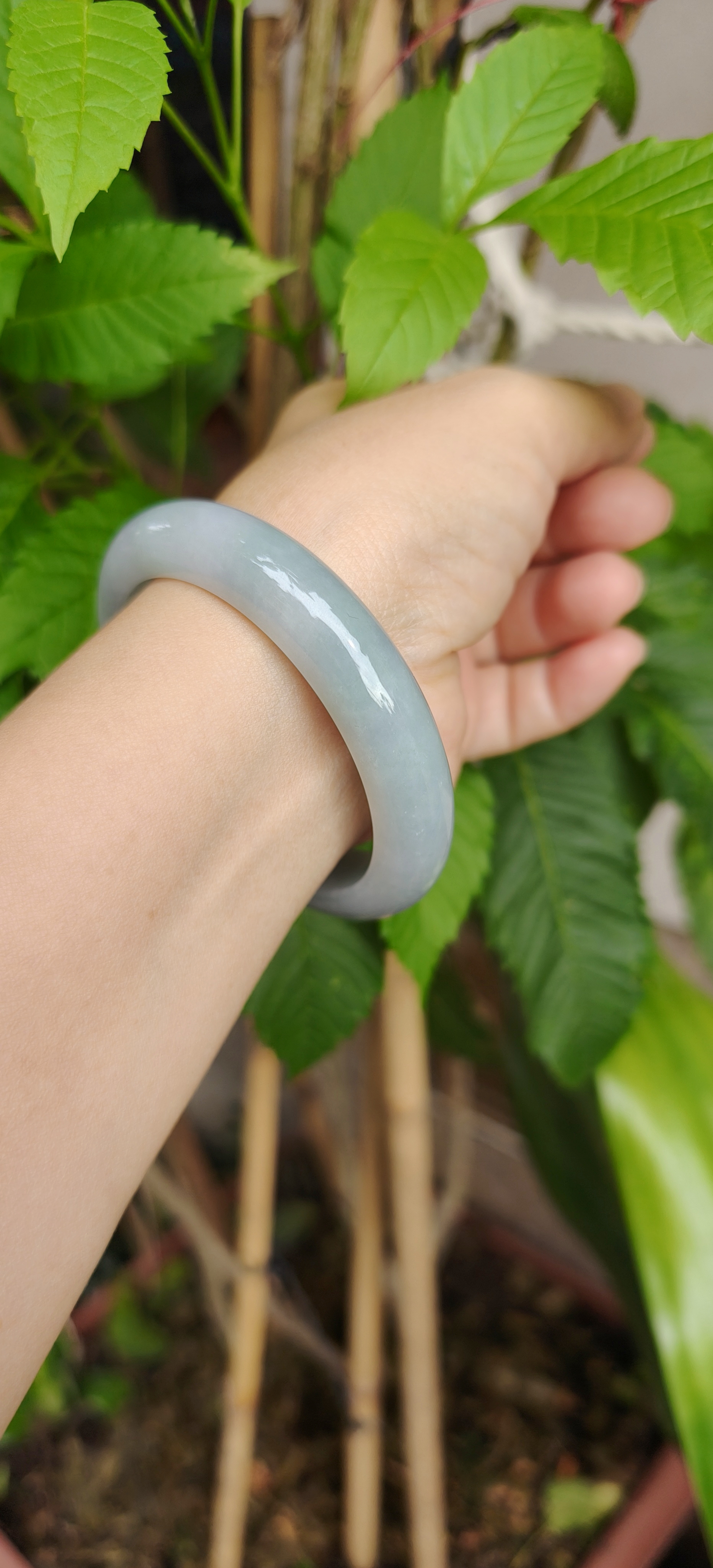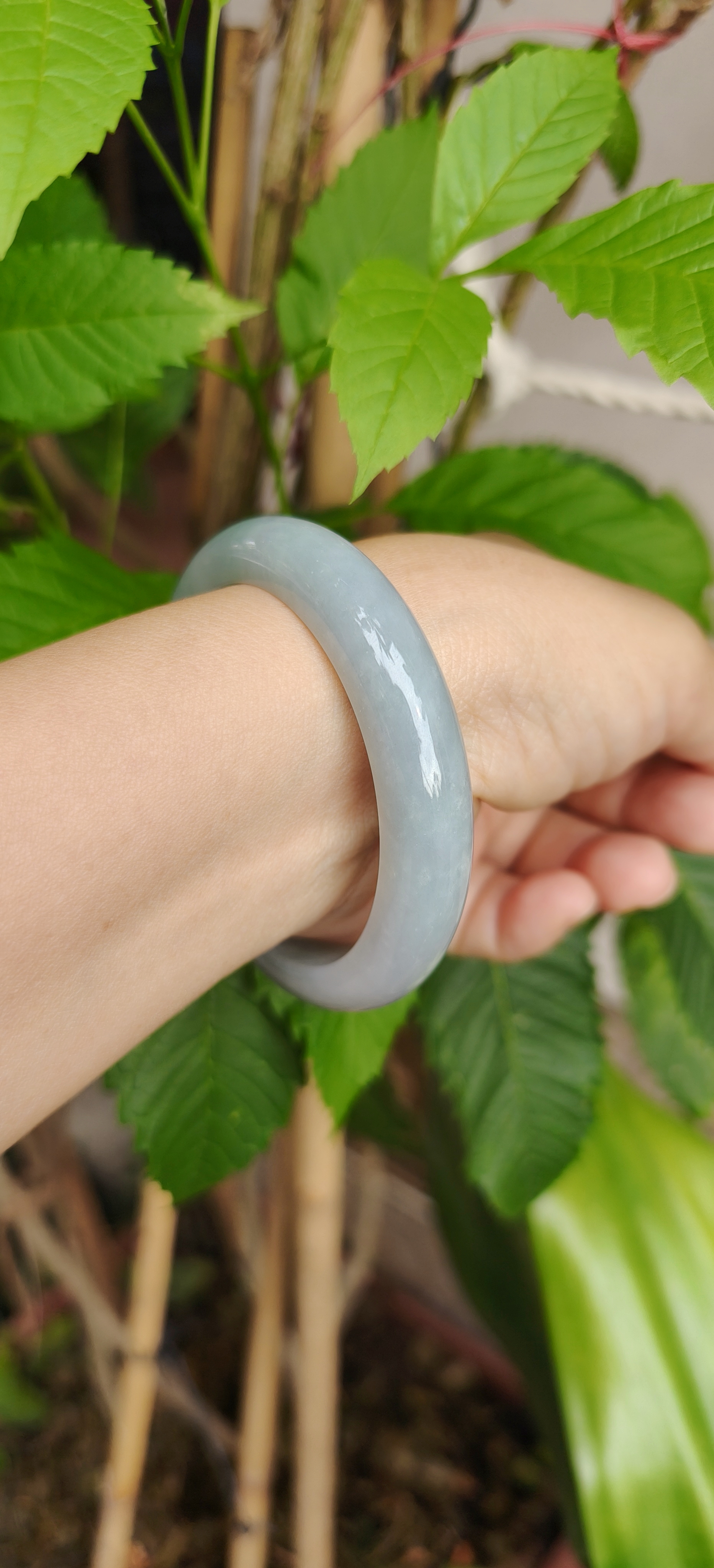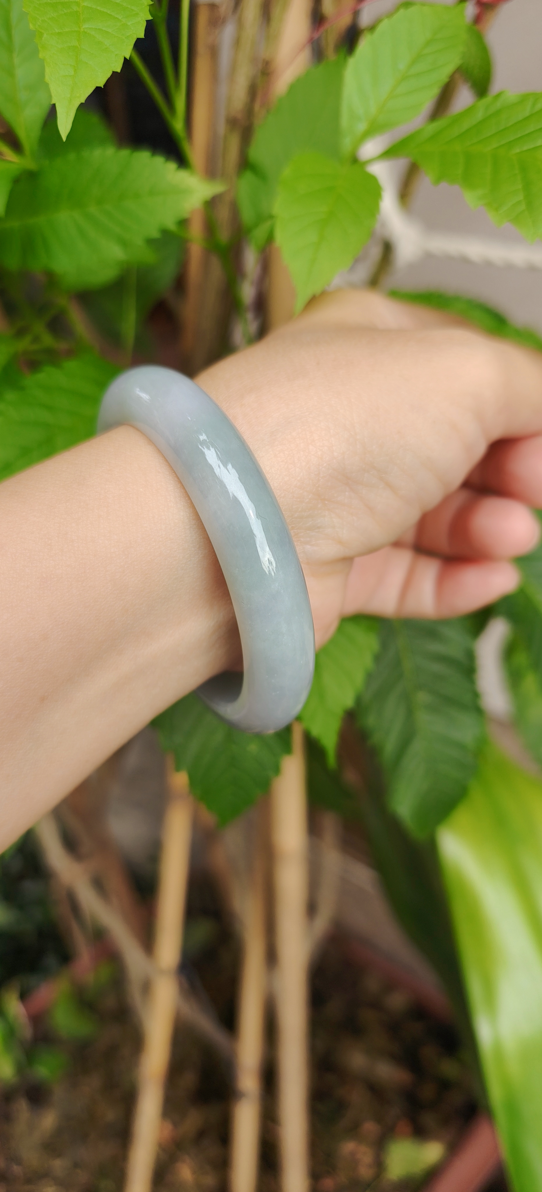 Chiếc vòng tông sắc có vẻ gần gia đình Monet này thật sự đẹp theo một cách rất tinh tế — tông ngọc xanh xám như sắc trời Paris những buổi sớm, êm dịu mà sâu thẳm, trong vắt mà vẫn giữ lại chút sương mờ tự nhiên. Ánh bóng phản chiếu nhẹ như nét cọ Monet trên mặt nước, khiến vòng mang một vẻ đẹp mơ màng, thanh tao và vô cùng nghệ thuật.