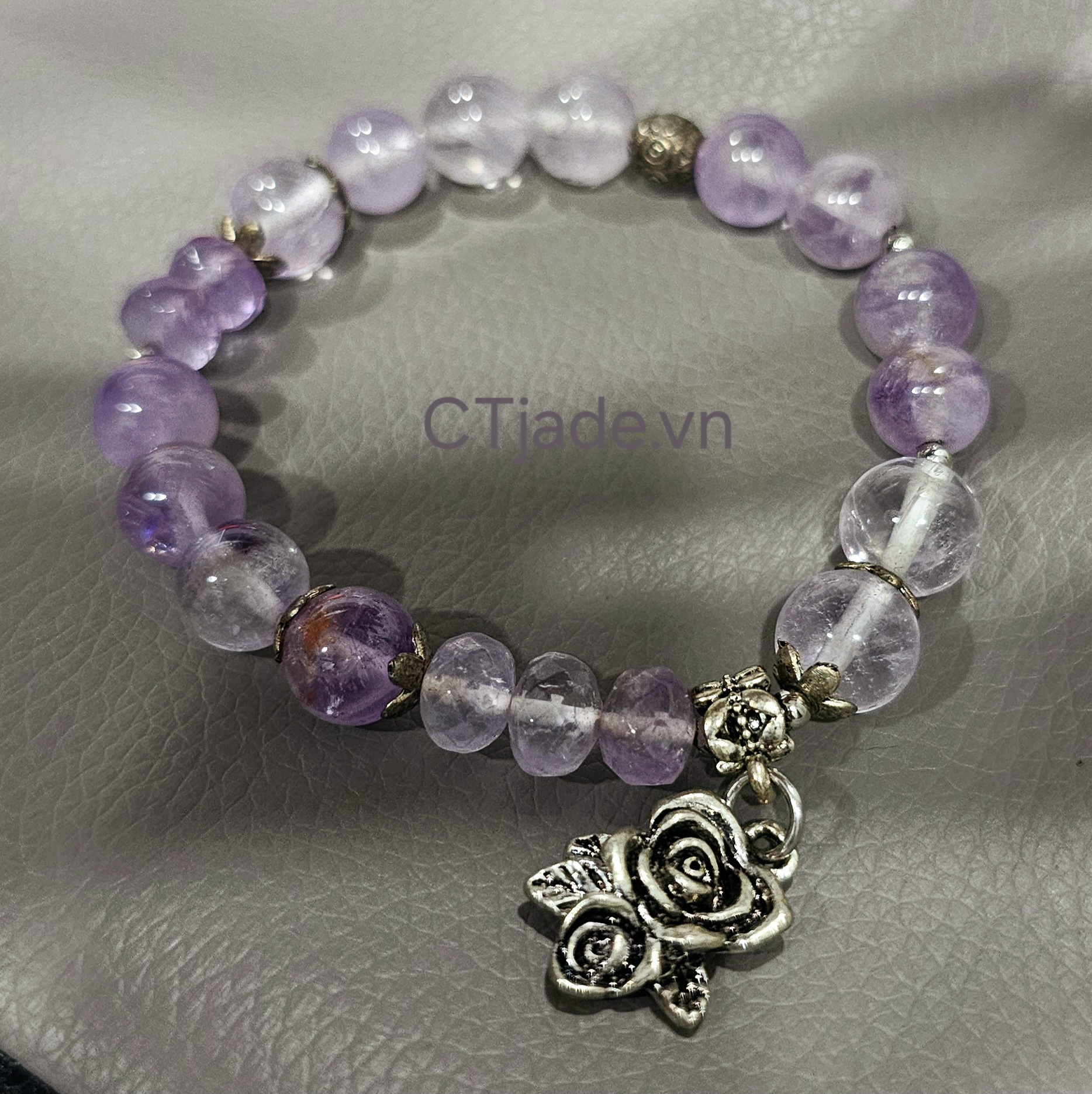 - Màu tím có tông từ nhạt đến hơi đậm chủ yếu chiếc vòng này chọn những viên đá trong, sắc tươi sáng trẻ trung!