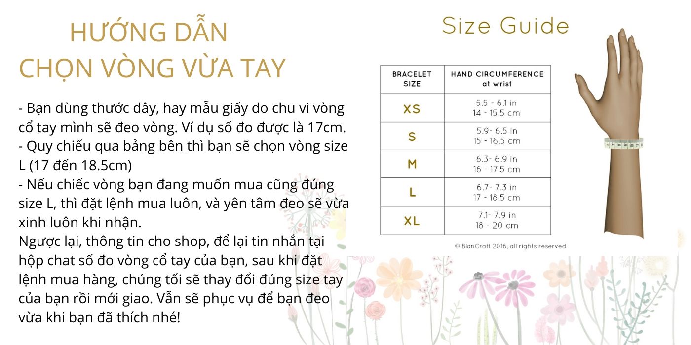 Bạn có thể liên hệ Shop đặt theo size tay bạn muốn nhé. Hãy đo sát vòng quanh cổ tay bạn nơi đeo vòng xem chúng được bao nhiêu cm nhé, báo đúng con số đó việc cộng thêm cho thoải mái và cân đẹp để shop lo nhé. Sản phẩm không có sẵn, Shop sẽ báo giá theo chất lượng đá và giá thực tế tại thời điểm đặt đơn hàng nhé.